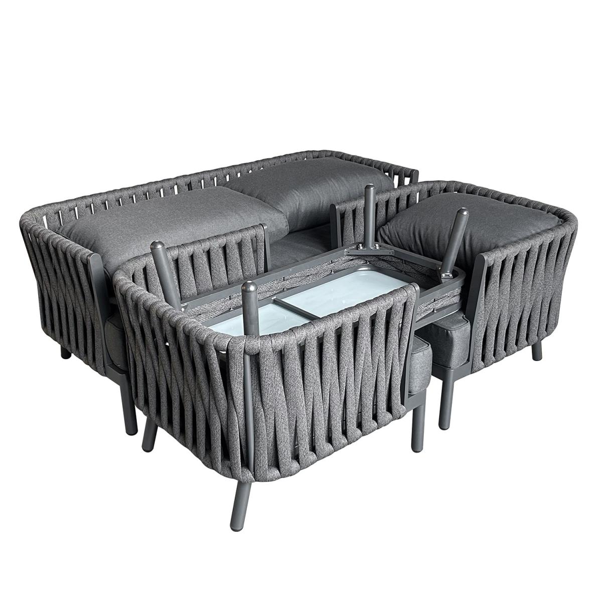 Rust-resistant aluminium with powder-coated frames help to withstand the outdoor elements. A continuous thick rope-weave back and sides combine unique design with ergonomic comfort. The highly durable, scratch-resistant surface is easy to clean and maintain. Includes a 2-seater sofa, two armchairs, and a matching coffee table. Thick, supportive cushions with easy-to-clean, zip-off covers. Offers extra protection from rain, UV rays, and dust. Update your outdoor seating area with our cosy 4-seater sofa set, designed for comfort, durability, and modern elegance. It features a low-maintenance coffee table with a tempered glass tabletop, a 2-seater sofa, and two armchairs. The seating boasts a continuous rope-weave back and sides, offering the upmost comfort. This inviting outdoor sofa set is both as stylish as it is practical and perfect for relaxed dining and entertaining. It even includes a waterproof cover to protect your furniture season after season.