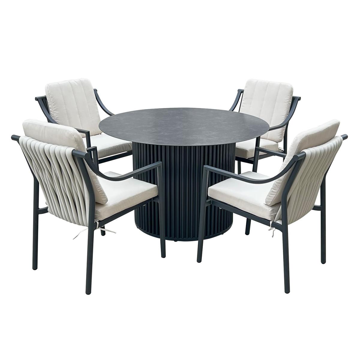 Rust-resistant aluminium withstands the elements while maintaining its sleek appearance. Adds a touch of contemporary elegance and provides stability, making it a standout centrepiece. Each chair features a thick rope-weave backrest, combining unique design with ergonomic comfort. Cushions with ties and removable cushion covers are easy to secure and keep clean. The highly durable, scratch-resistant surface is easy to clean and maintain. The modern design is ideal for garden patios, balconies, and decked areas. Elevate your dining experience with our 4-seater dining table set, designed to blend modern sophistication with exceptional durability. It features a sleek black table with a printed stone-effect tempered glass tabletop and a ribbed cylindrical base; this statement piece adds contemporary elegance to any outdoor space, whether your garden patio or decked area. It includes four matching beige dining chairs, which ensures superior comfort and style. Each chair boasts a thick rope-weave backrest, offering a chic, structured aesthetic, and the seat cushions include tie fastenings and removable zipped covers. This dining set is both luxurious and practical, perfect for alfresco dining.