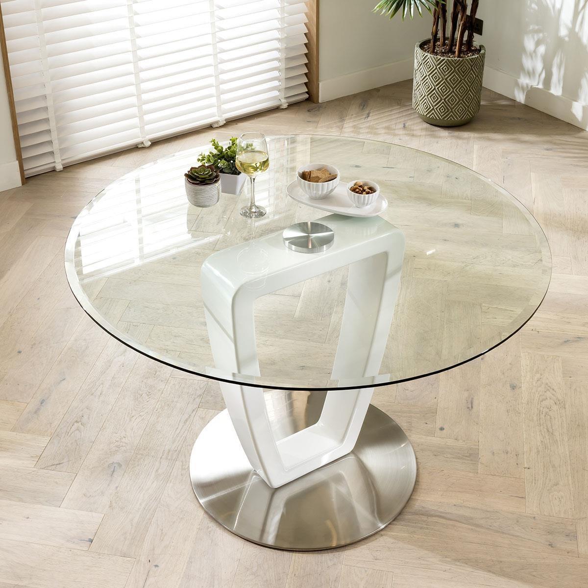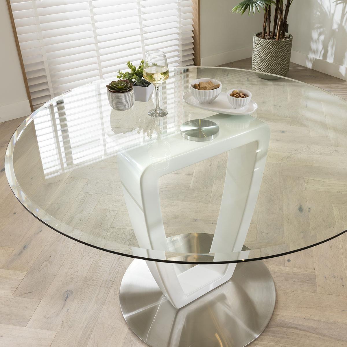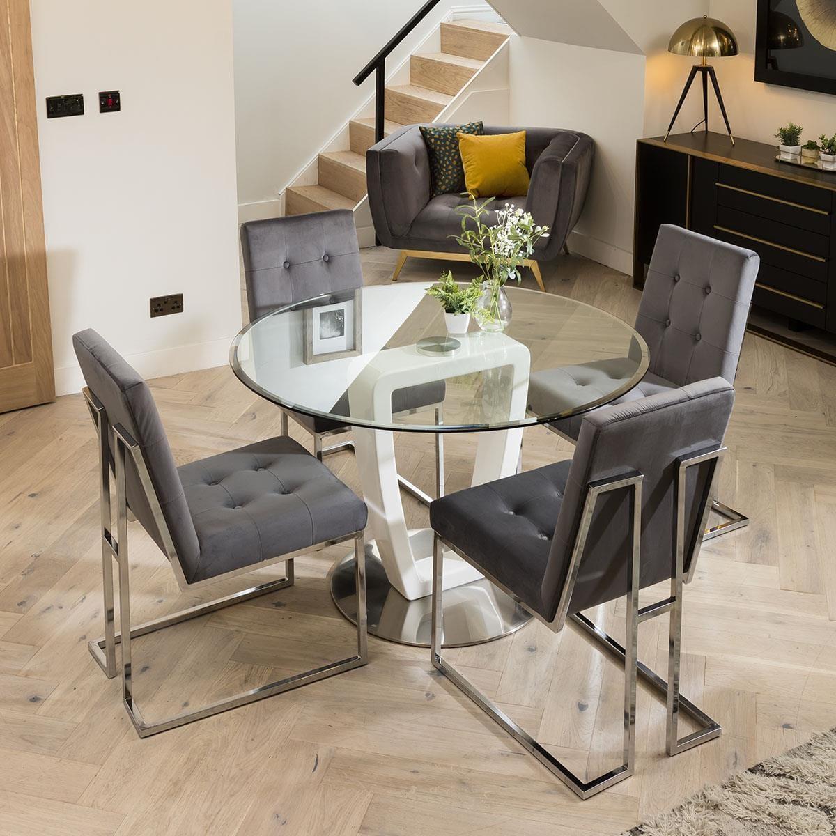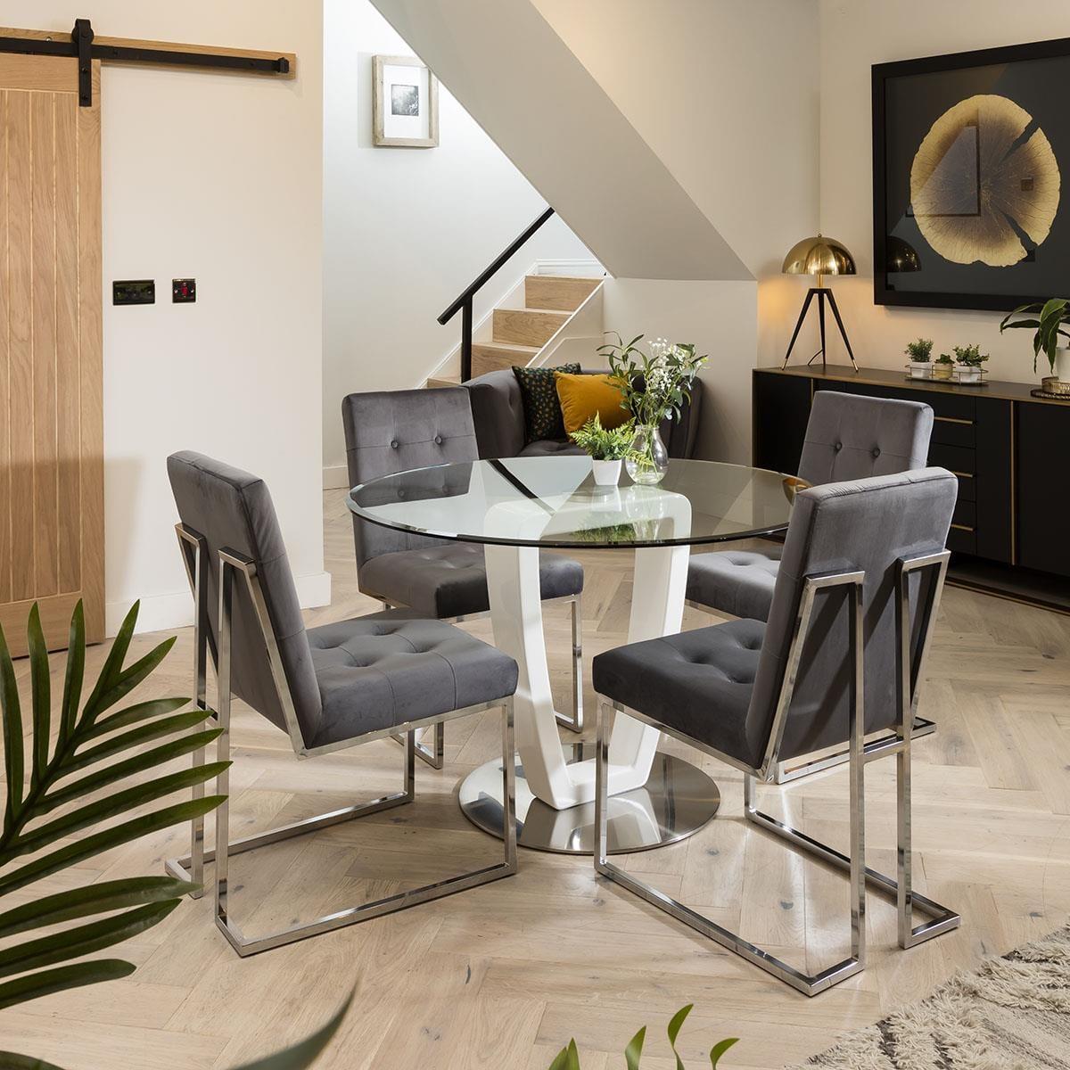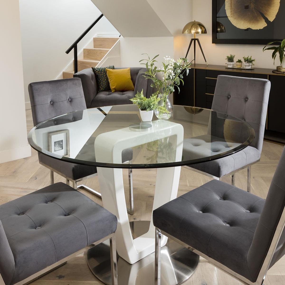With its clear glass top and white stem, our modern 120cm round dining table encapsulates sleek and contemporary design. Its premium 10mm tempered glass top is combined with 25mm bevel incorporated into the edge for added simple, stylish detail. All of this is combined with a unique high gloss white pedestal, for a style that is nothing short of striking. Maximize your dining room decor with the luxury grey velvet dining chairs from the JLA Collection. A glam deco dining chair, an icon of design with modern lines and simple beauty. The JLA Collection features soft and stain-resistant performance grey velvet upholstery for a streamlined modern look. This stylish chair rests atop a sleek chrome geometric base and the striking mix of silver metal with beautiful velvet makes this a statement piece. If you need more information about this product, use the Live Chat service to speak to the team or send us a message. Spread the cost our with interest-free finance options. Minimum spend applies. W120cm D120cm H76cm Round dining sets are great for social occasions Features modern velvet dining chairs