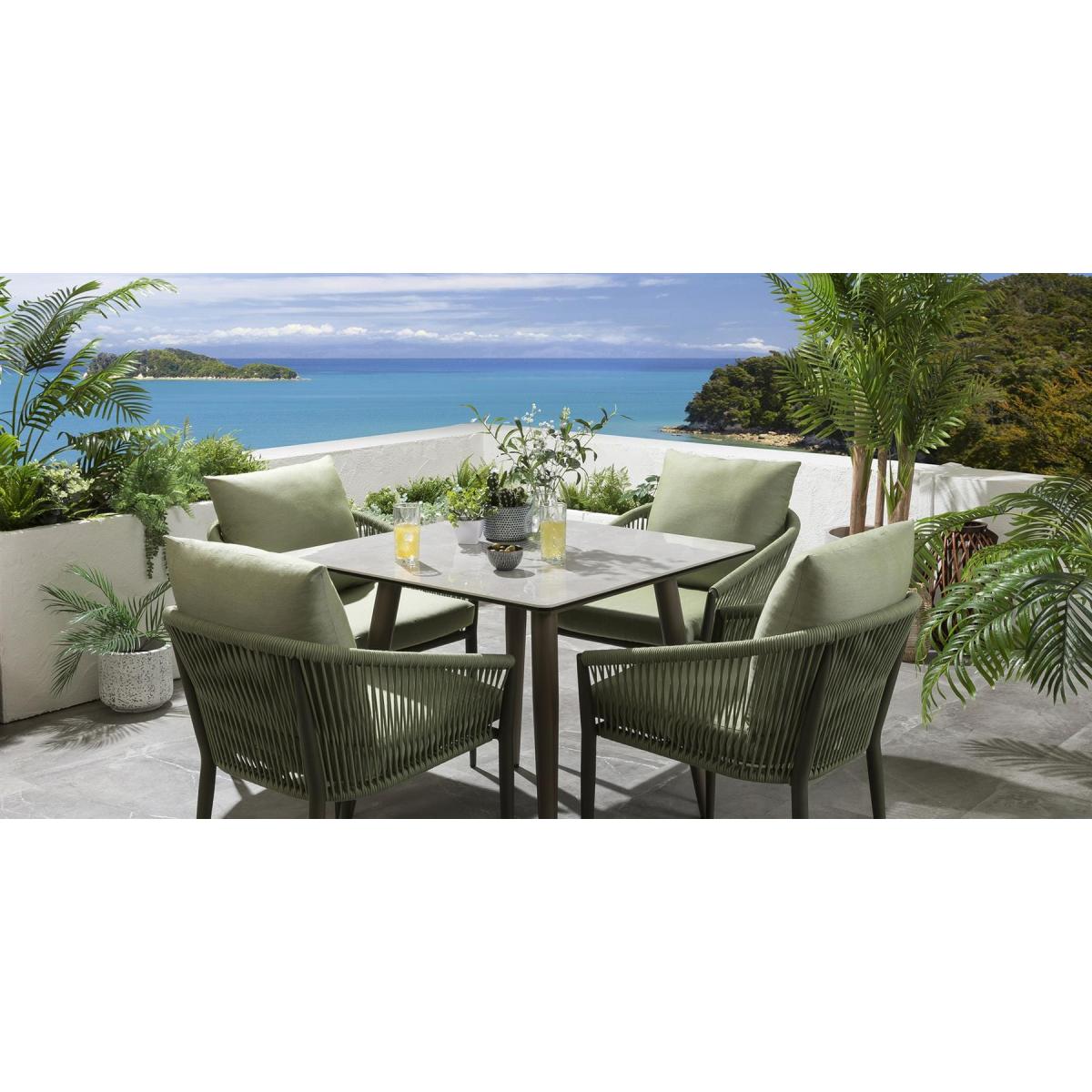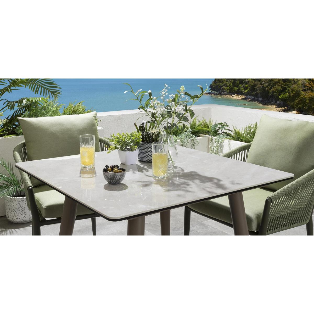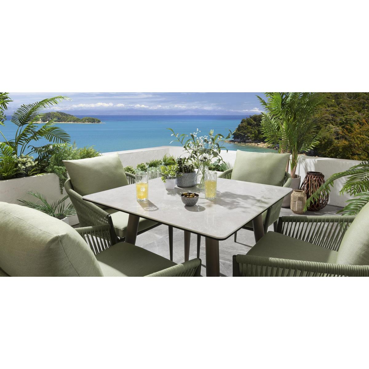 The Quatropi Luxury Outdoor Dining Set is the perfect choice for those looking for a stylish and modern outdoor dining experience. Featuring a 90cm square beige aluminum frame, ceramic top table and 4 premium aluminum frame dining chairs with thick soft olive green cushions, this set provides a contemporary and comfortable ambience. It also comes complete with a 5 year warranty and weather cover to ensure durability and longevity. Transform your outdoor space with this luxury dining set - perfect for entertaining guests and making memories. Spread the cost our with interest-free finance options. Minimum spend applies.
