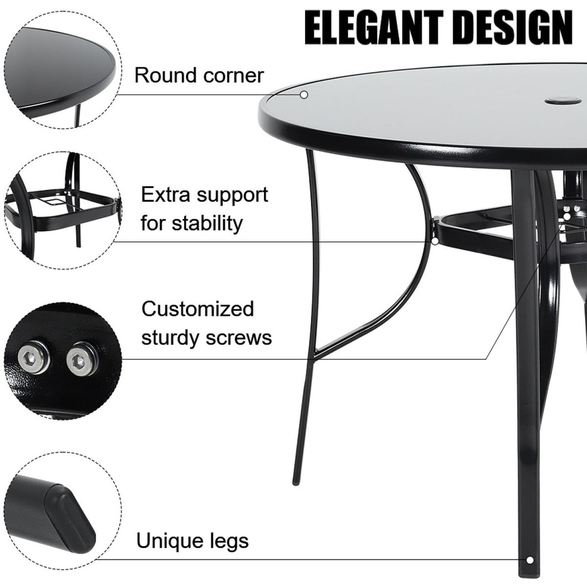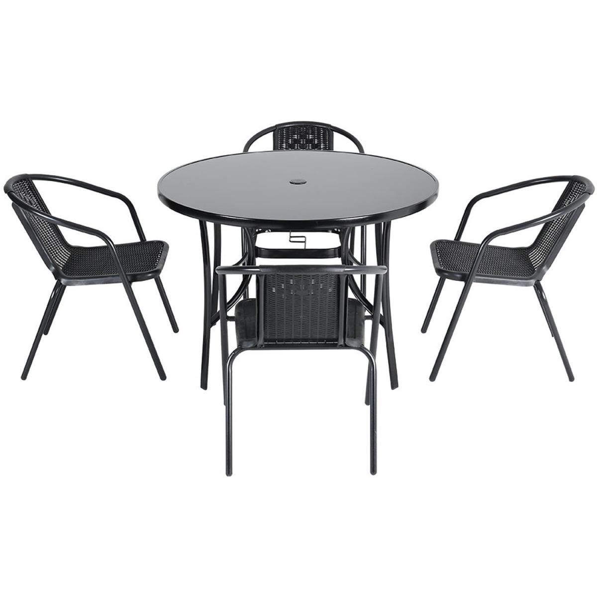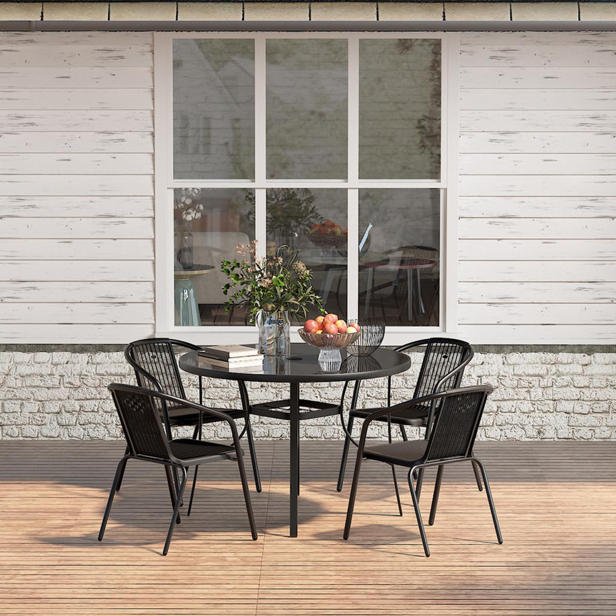 This outdoor bistro set, with its delicate appearance and high quality, can make a great experience for you. Modern and practical 5-piece patio furniture set increases a fashion style to your garden or porch. It includes a tempered table silked in black and 4 plastic stacking chairs. There's a hole in the middle of the table, where you can place a parasol to protect you from the sunlight. In a contemporary style, it's perfect to compliment your garden or balcony.