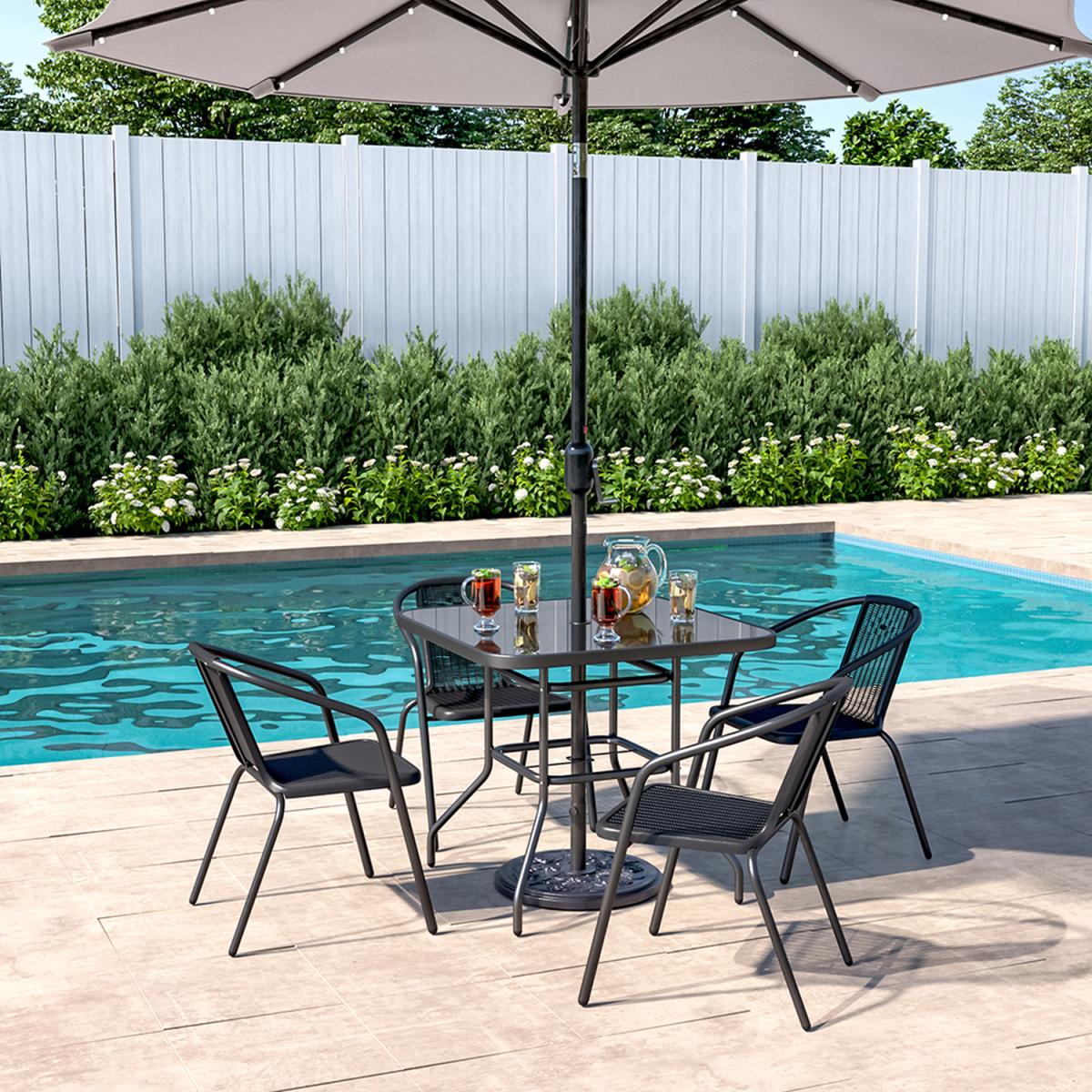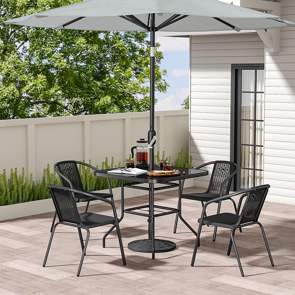 This outdoor bistro set, with its delicate appearance and high quality, can make a great experience for you. Modern and practical 5-piece patio furniture set increases a fashion style to your garden or porch. It includes a tempered table silked in black and 4 plastic stacking chairs. There's a hole in the middle of the table, where you can place a parasol to protect you from the sunlight. In a contemporary style, it's perfect to compliment your garden or balcony.