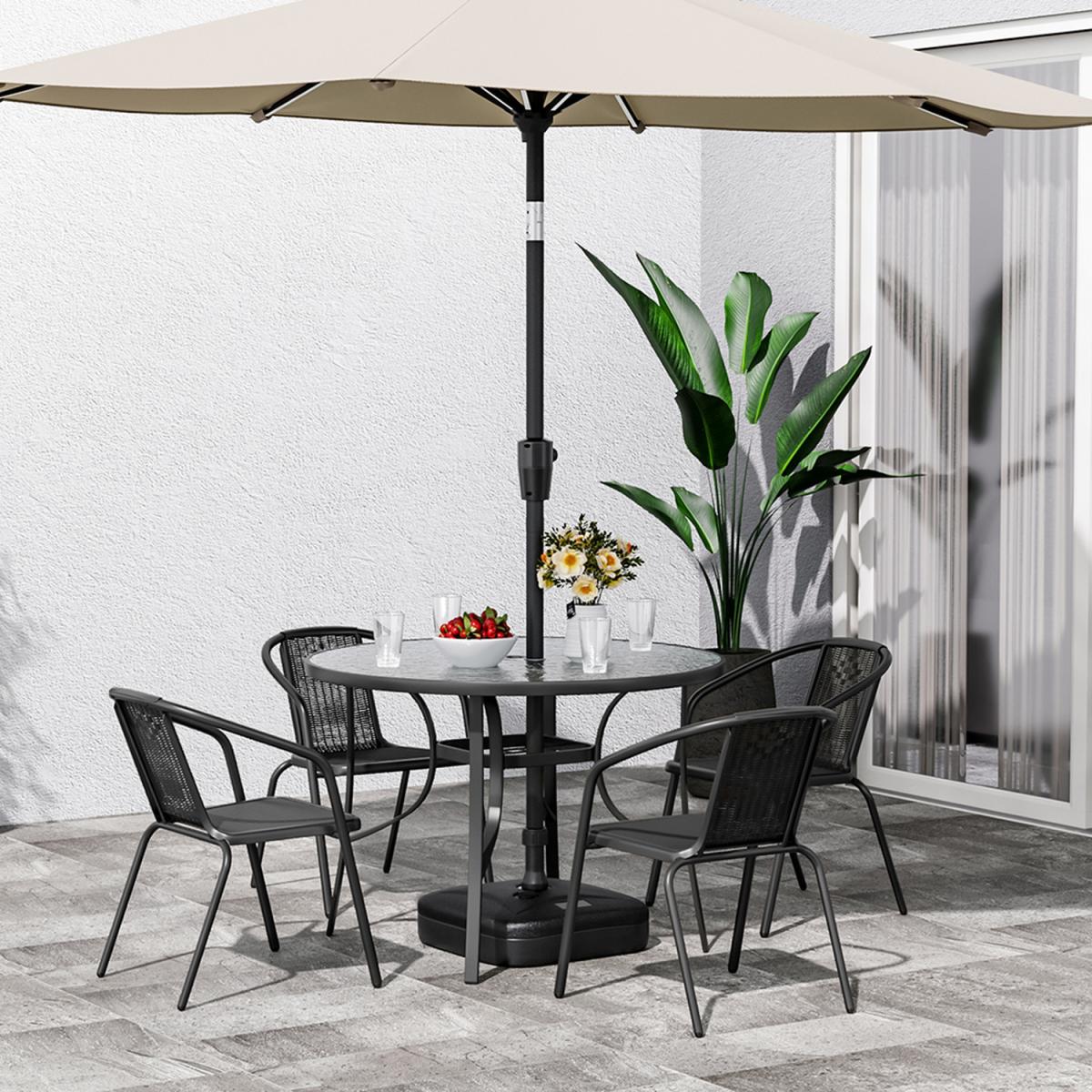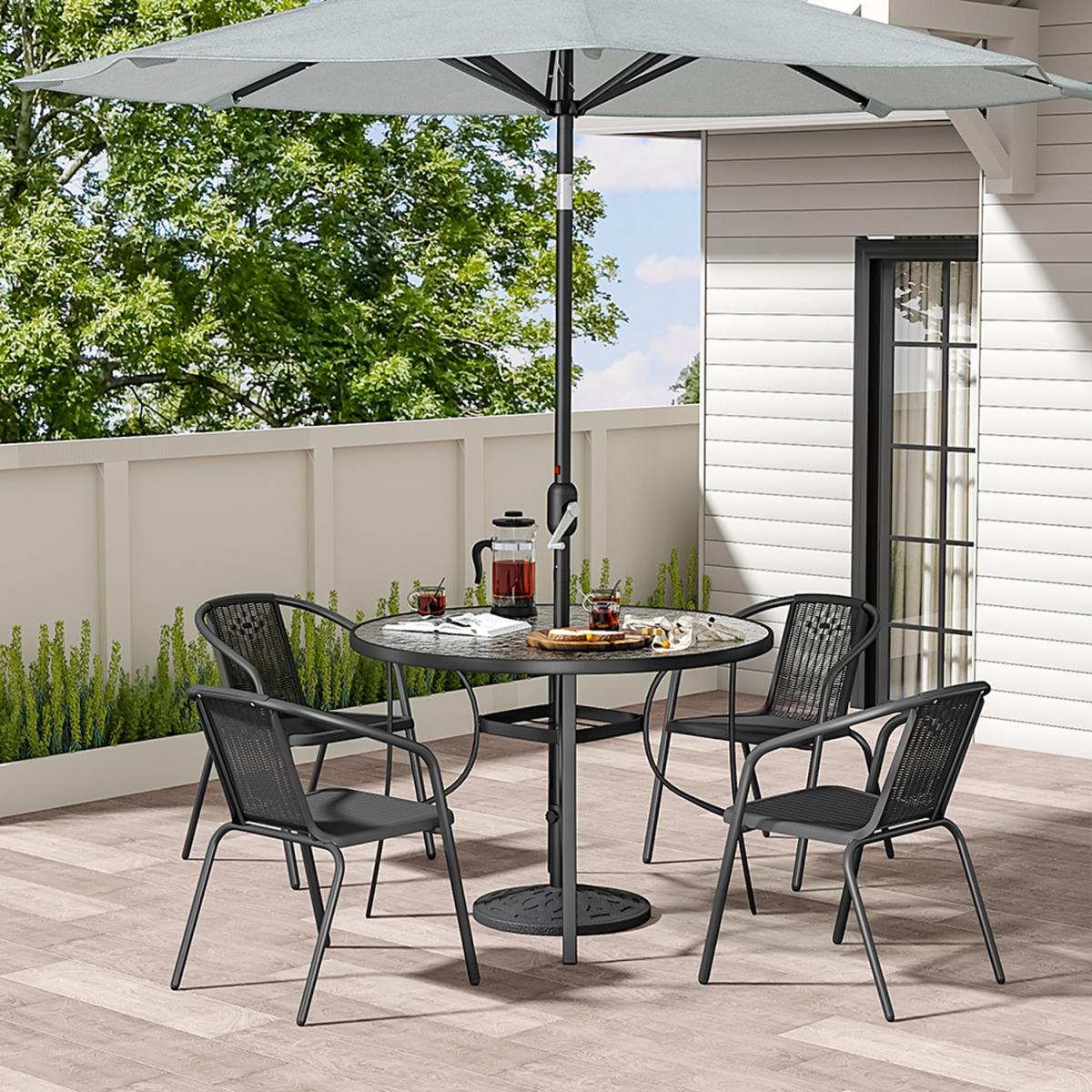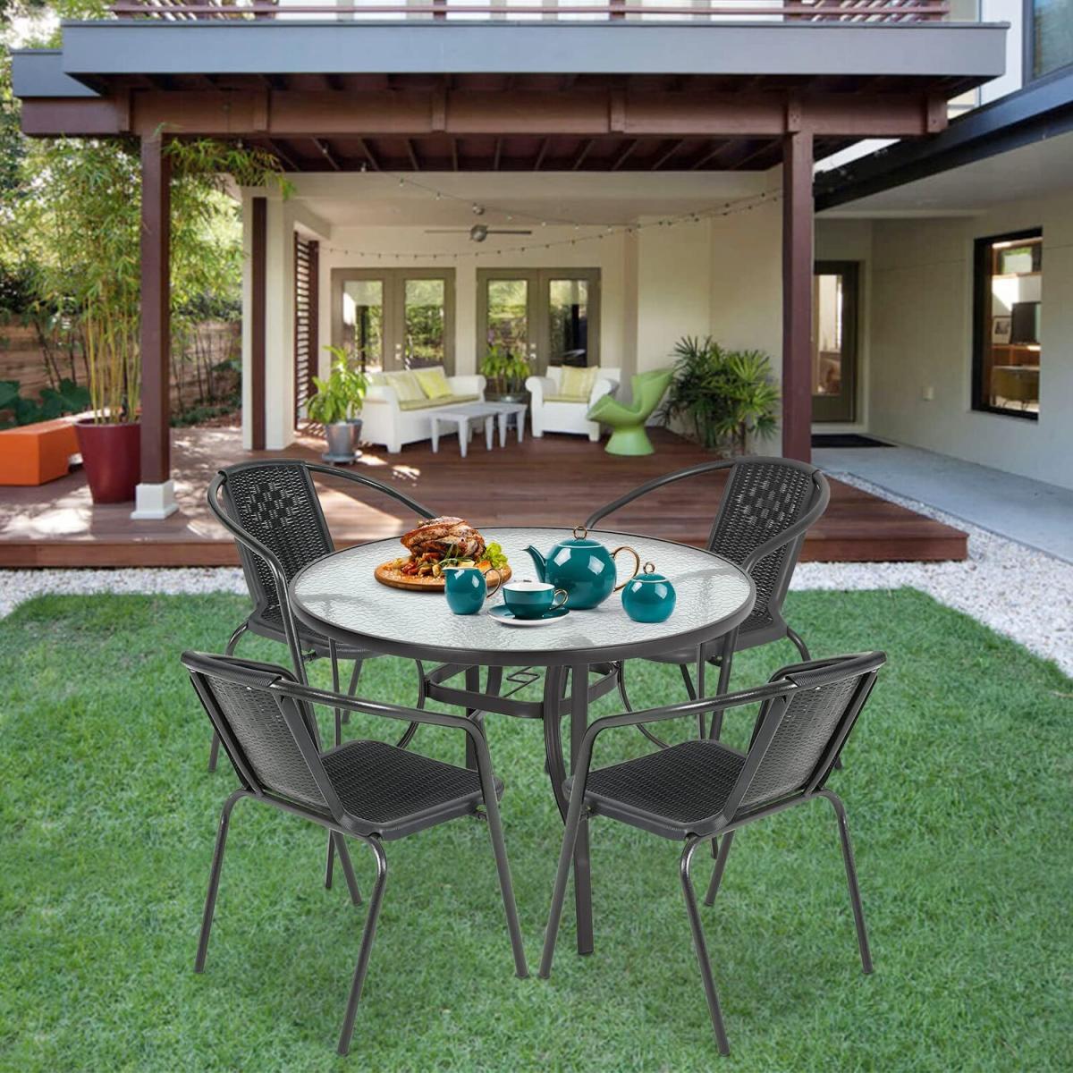 This outdoor bistro set, with its delicate appearance and high quality, can make a great experience for you. Modern and practical 5-piece patio furniture set increases a fashion style to your garden or porch. It includes a transparent rippled tempered table and 4 plastic stacking chairs. There's a hole in the middle of the table, where you can place a parasol to protect you from the sunlight. In a contemporary style, it's perfect to compliment your garden or balcony.