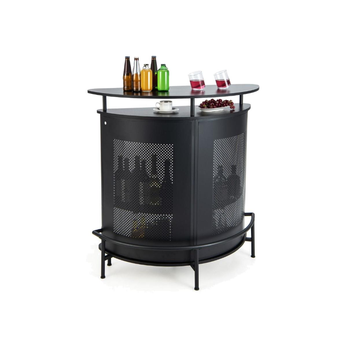The 4-tier metal bar table has 1 curved top, 1 open shelf under the top, 2-tier shelves and 3-row glass holders for you to display or store various items. Plus, different from others with no metal front and no footrest, our bar unit is designed with an eye-catching metal front for safety and an extra footrest for comfort. What's more, we also equip it with 6 adjustable feet to enhance overall sturdiness. Additionally, combining industrial design with chic style, this 4-tier bar unit makes your home a perfect place for parties. If you are looking for a bar table like this, do not hesitate to place an order!