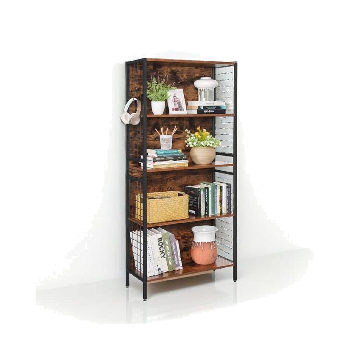 I really rate this four-tier brown metal-frame bookcase for its blend of warmth and structure - the wood-effect shelves soften the industrial black frame, making it a versatile piece rather than just a storage unit. It suits everything from a minimalist Scandi living room to a loft-style study or even a cosy home office. Styling tips: alternate stacks of books (colour-coordinate spines if you like) with decorative objects such as a small plant, a ceramic vase or a framed photo. Leave a little breathing space on each shelf to avoid a cluttered look, and use a woven basket on the bottom tier to hide away cables or magazines. The result is a neatly organised display that still feels relaxed and inviting.