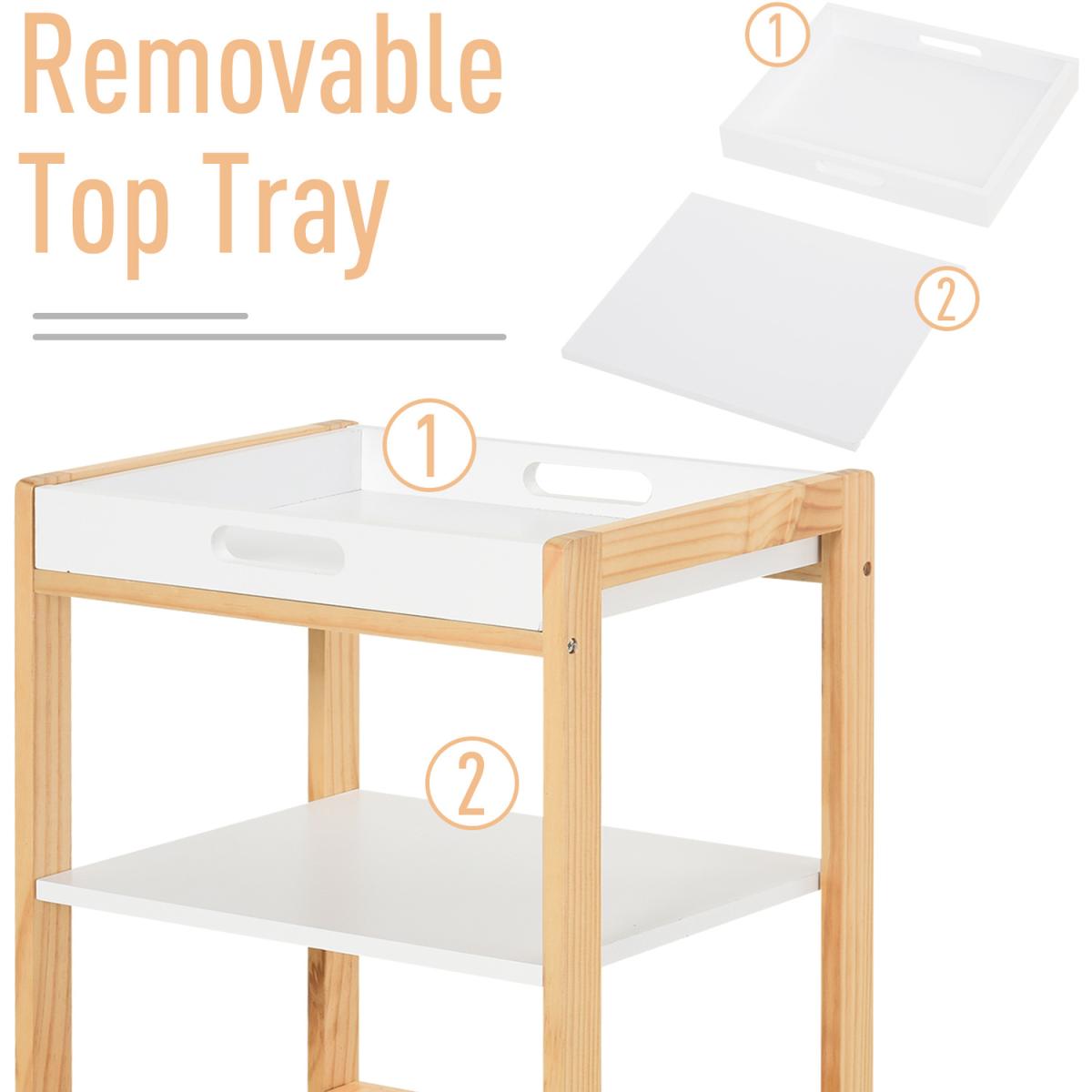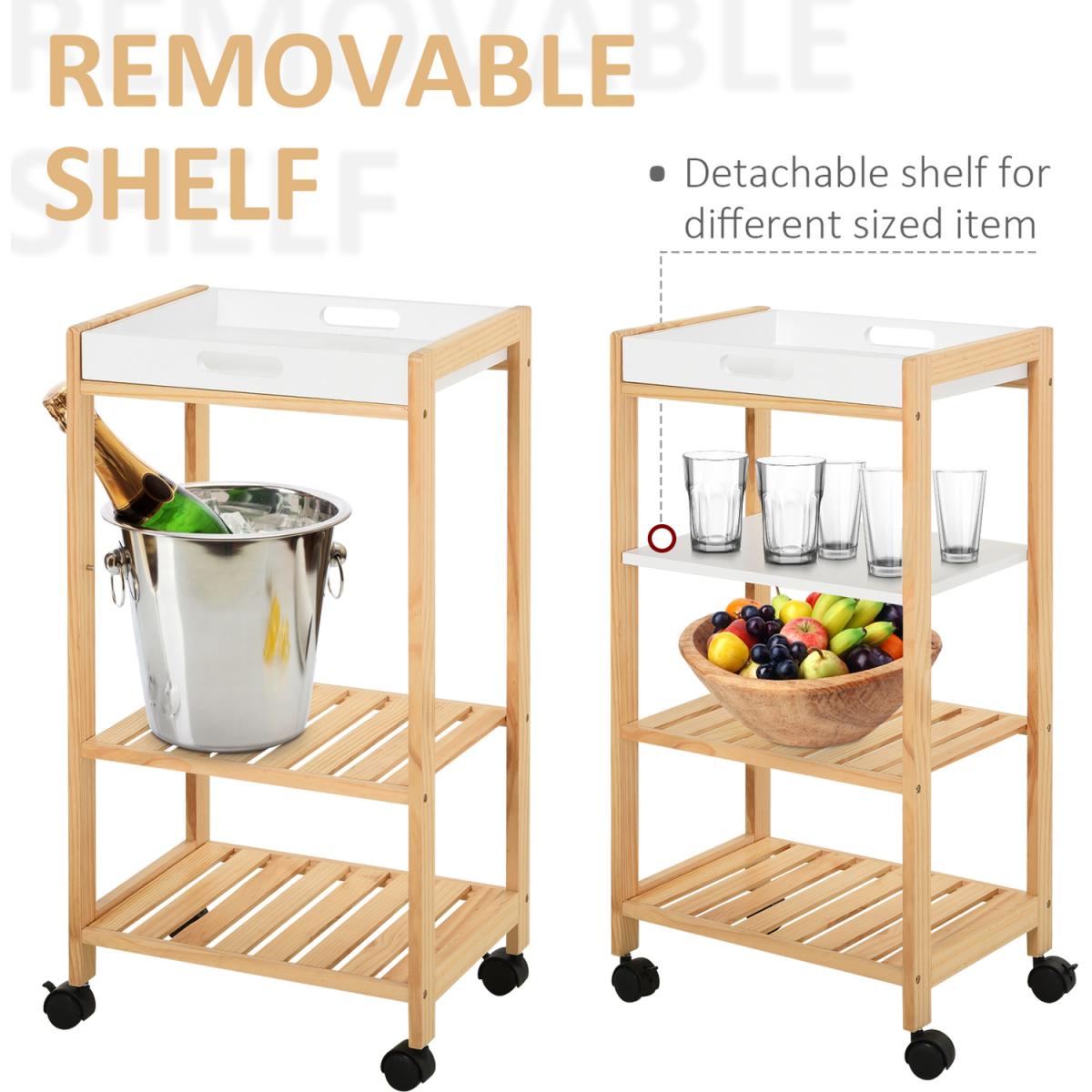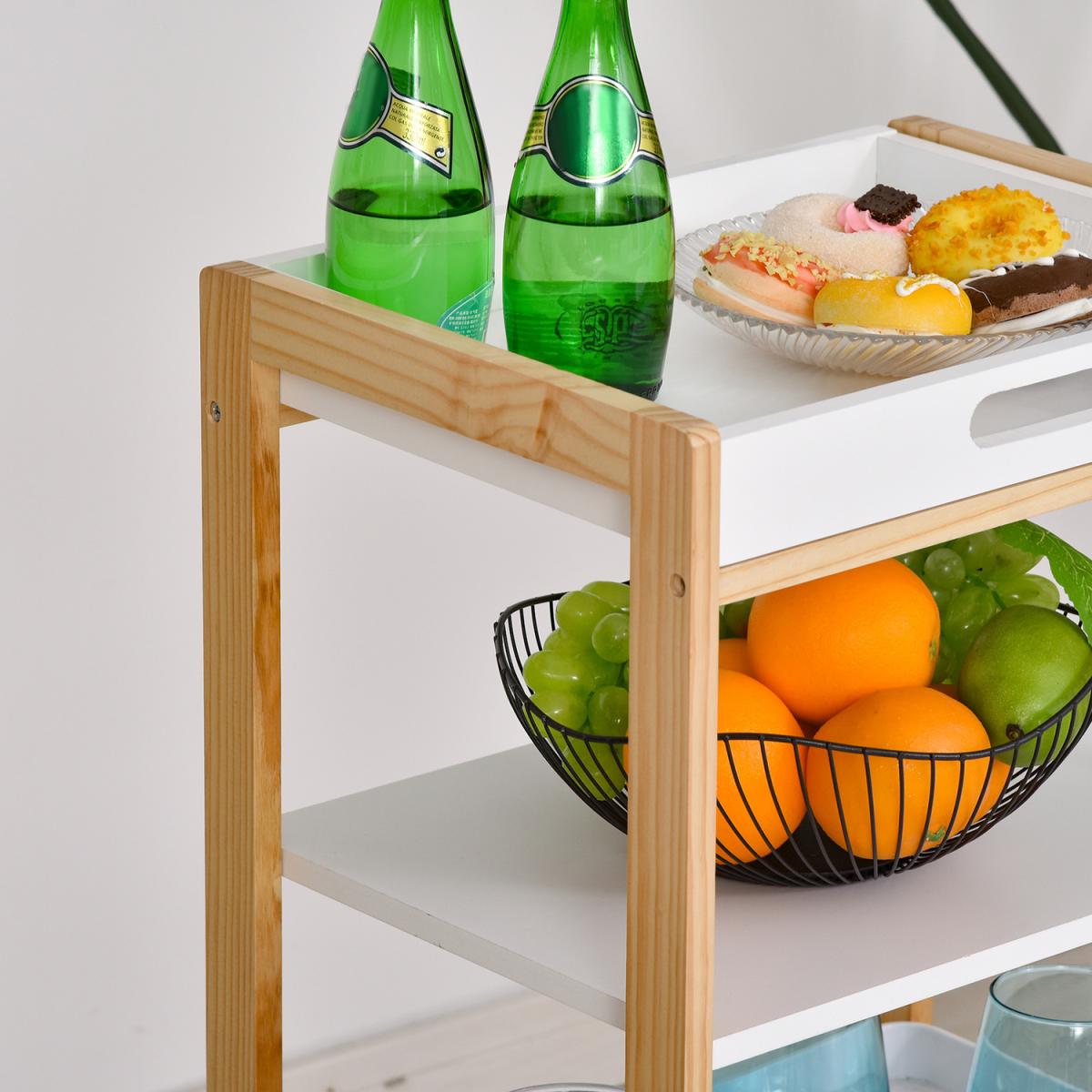 Keep your kitchen clean and tidy with this trolley from HOMCOM. Made from an MDF and wood blend, it is durable for everyday use and features a top tray for safe storage which won't fall off, and three shelves below which also allow storage. Four wheels for easy movement, two of which can be locked to keep it stationary. Ideal for the home, office and beyond.
