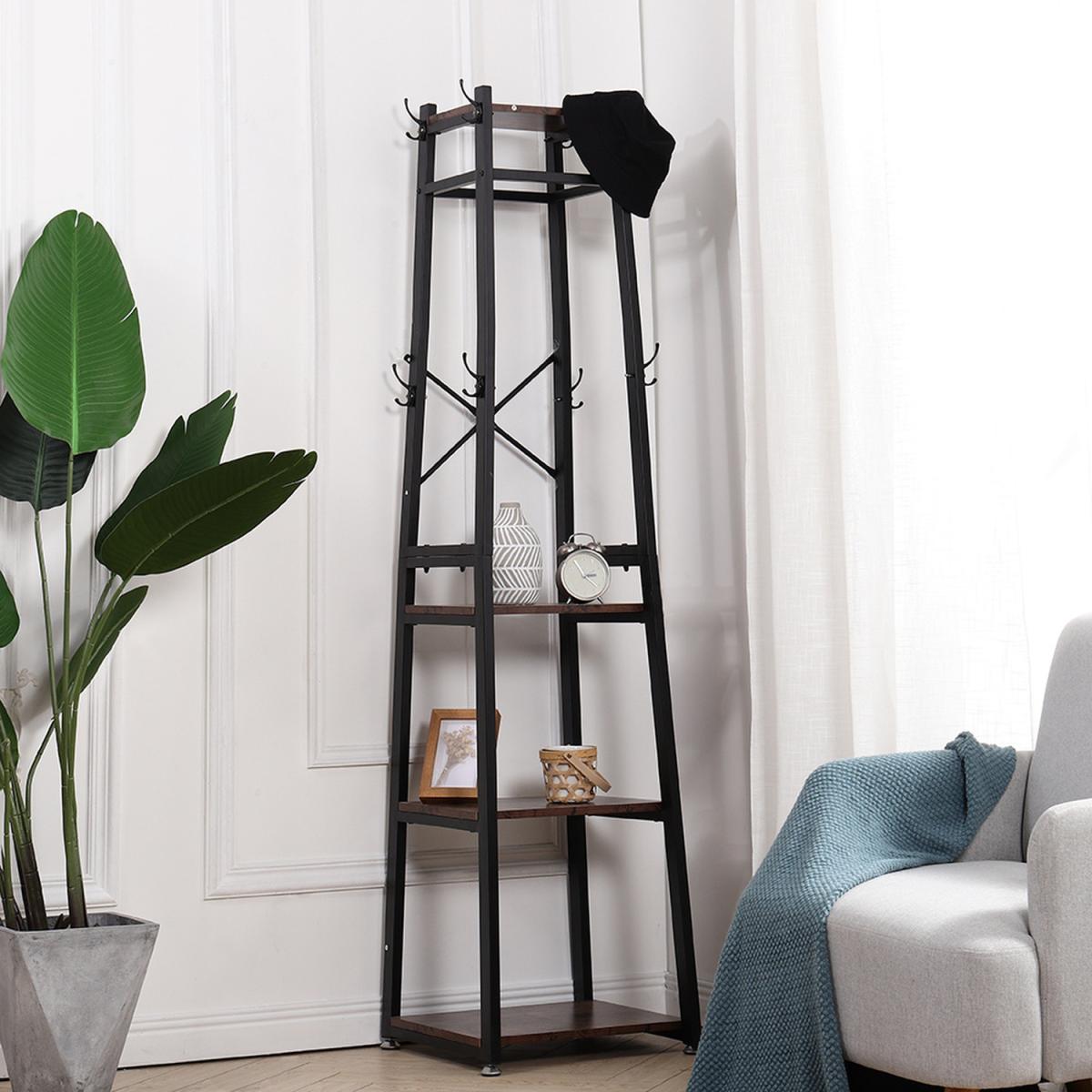 I’m a fan of this industrial-style rack for its slim, space-saving design and the warm contrast between the brown timber shelves and black metal frame. It suits urban lofts, modern farmhouse hallways or minimalist bedrooms alike, slipping neatly into narrow corridors or beside a front door where you need storage without bulk. For styling, group items by function and height: hats and scarves on the top hooks, a woven basket on the bottom shelf for umbrellas or shoes, and staggered decorative accents (think a small plant, a framed print, a couple of neat books) on the middle tiers. Keeping your colour palette to two or three tones will prevent the display from looking cluttered, while a pop of greenery brings the whole look to life.