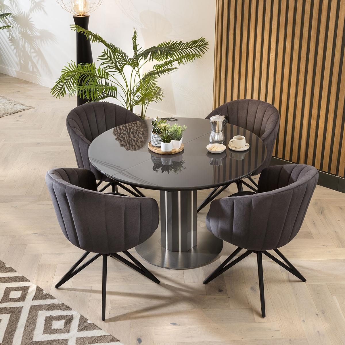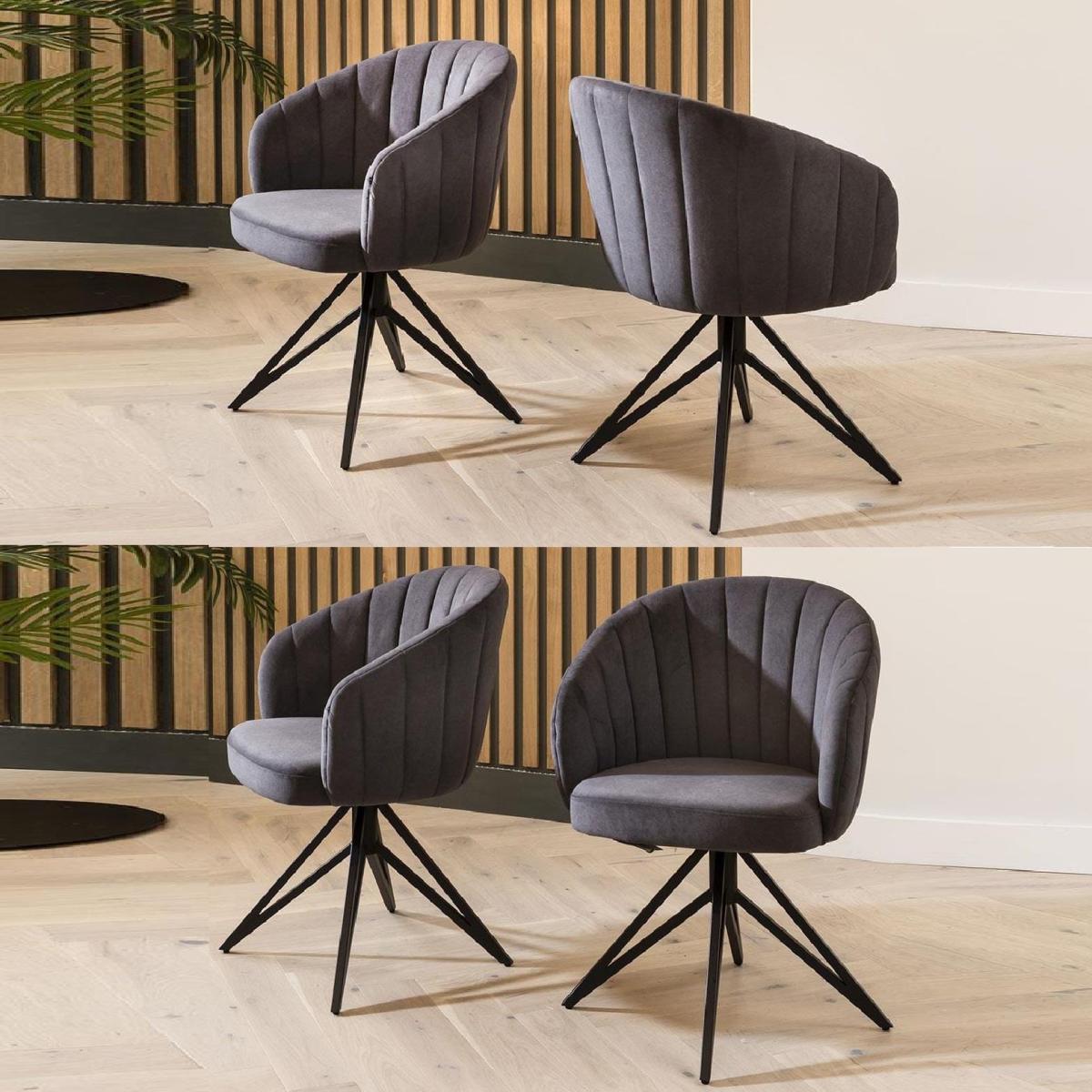 Our set of 4 Ex Display Hattie swivel base carver dining chairs with arms - the perfect blend of comfort, style, and modern design. Crafted with the utmost attention to detail, this modern dining chair features thick cushioned seats, upholstered in premium soft grey fabric, elevating your dining room to a whole new level. Wrapped in a luxurious premium grey fabric, the chair exudes an air of sophistication that complements any dining room decor. The line tufting detail adds a touch of elegance, showcasing the chair's meticulous craftsmanship. The rounded wrap-around back and high supportive backrest not only provide exceptional lumbar support but also create an inviting atmosphere for gatherings that linger well beyond dessert. Designed for both aesthetics and functionality, the swivel base allows for easy conversation and movement during meals, making every dining moment enjoyable. The inclusion of armrests further enhances comfort, making those long dinner conversations even more delightful. The thick cushioned seat and backrest cradle your body in comfort, ensuring you can savor your meals in utmost relaxation. PLEASE NOT THESE CHAIRS ARE EXDISPLAY AND ALTHOUGH IN GREAT CONDITION DO CARRY SOME SLIGHT MARKS ESPECIALLY ON THE LEGS, SEE PICTURES FOR DETAILS. W62cm D61cm H81cm Set of 4 Ex Display Swivel Dining Chairs Contact the team on Live Chat to request a fabric sample