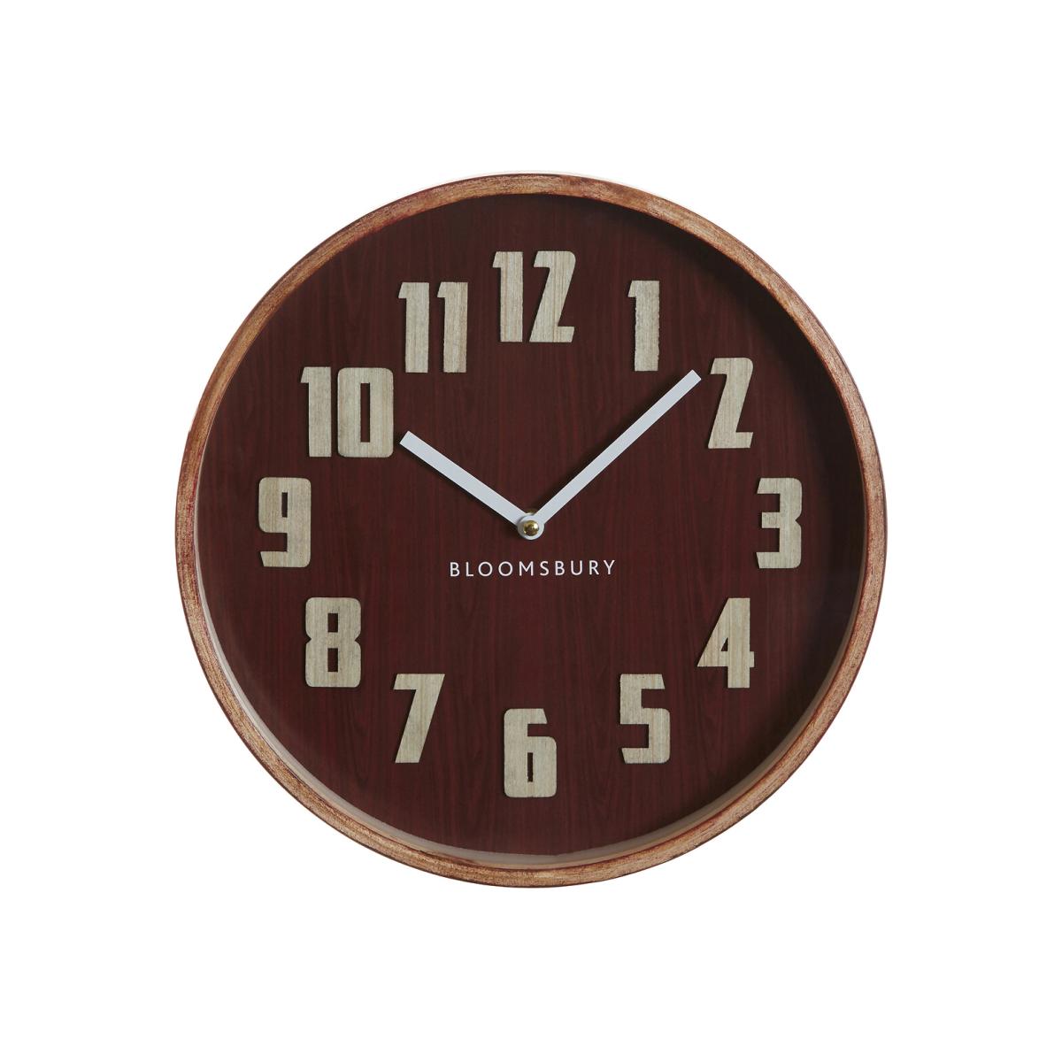 The round case is made from natural wood and has a red finish that blends in with the dial's darker tone. The large numbers are coloured white and have an aesthetic that evokes 1970's chic. Its minimal white hands are easy to read. White text stating "Bloomsbury" is displayed beneath the hands, and a clear glass pane covers the dial. Product Dimensions:Diameter 40cm. This product will be dispatched by one of our trusted suppliers. You’ll be contacted by their selected courier about your delivery.