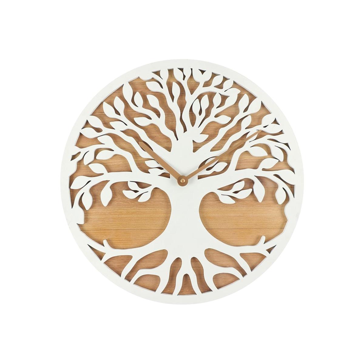 A 40cm round MDF clock featuring a white Tree of Life silhouette cut out on a wood effect background. This full, leafy tree with outstretched roots is a popular spiritual symbol used in cultures around the world. One AA battery required (not included).