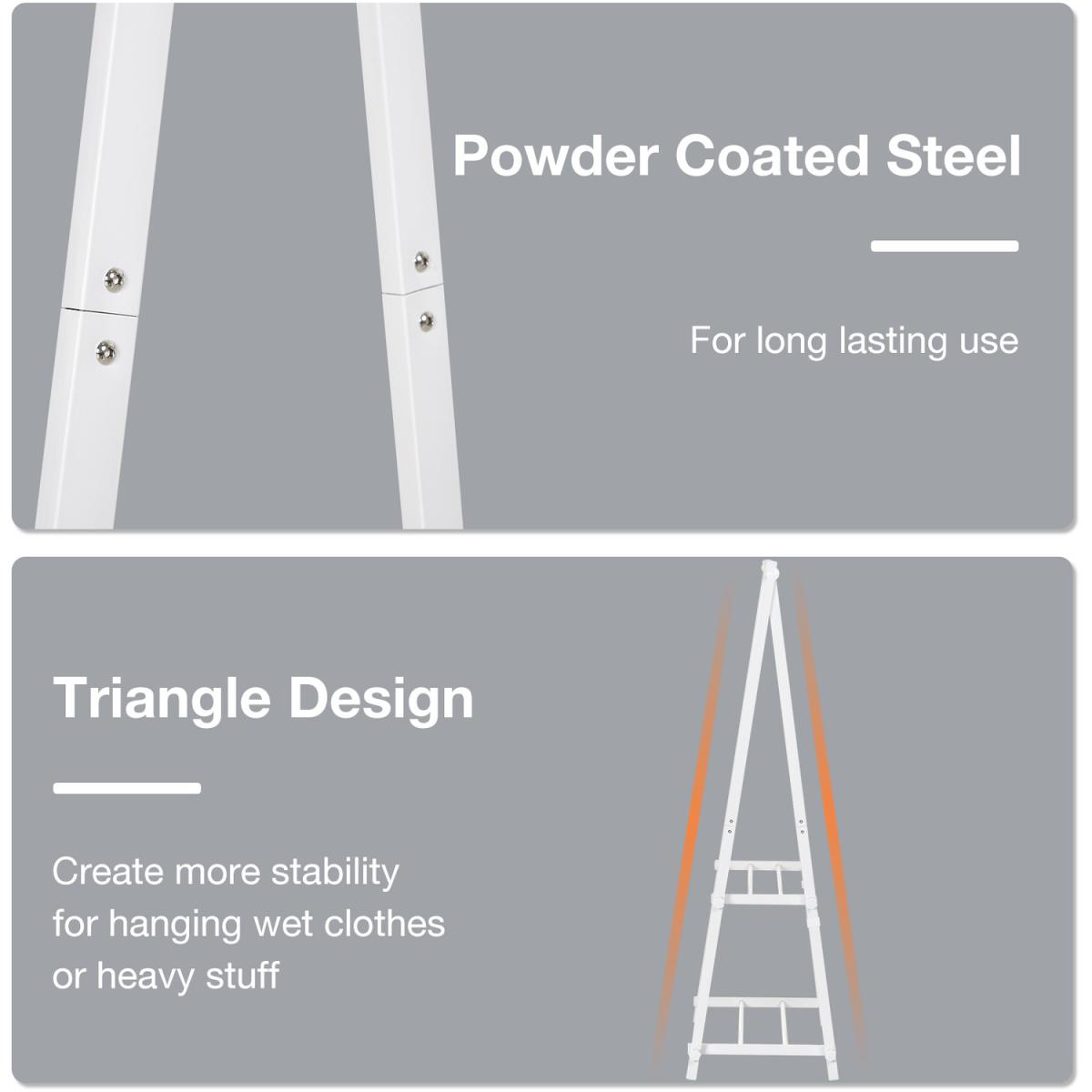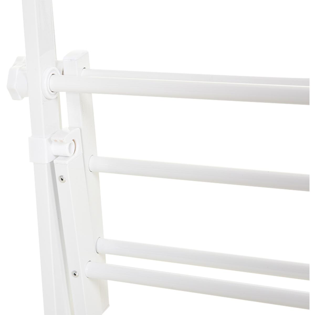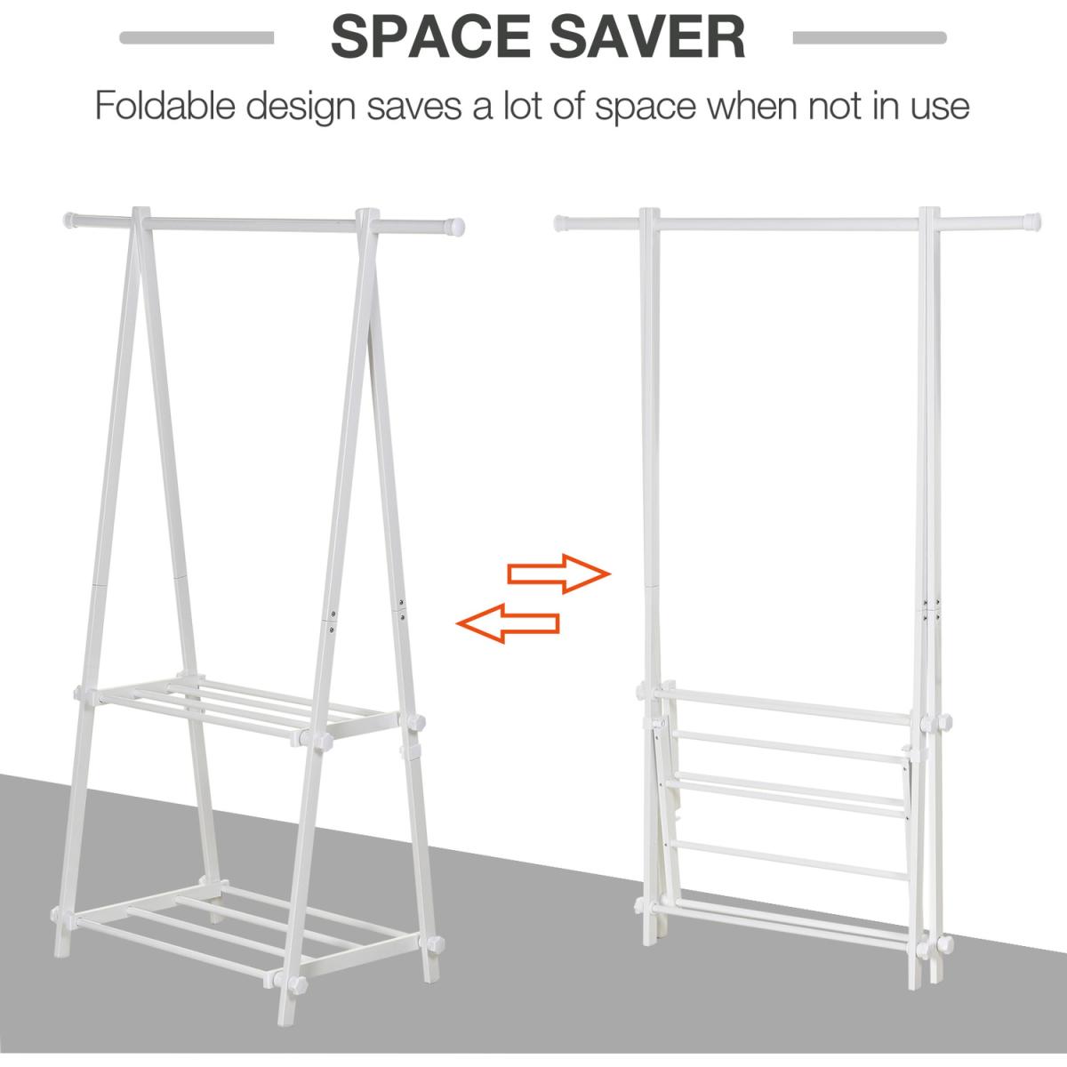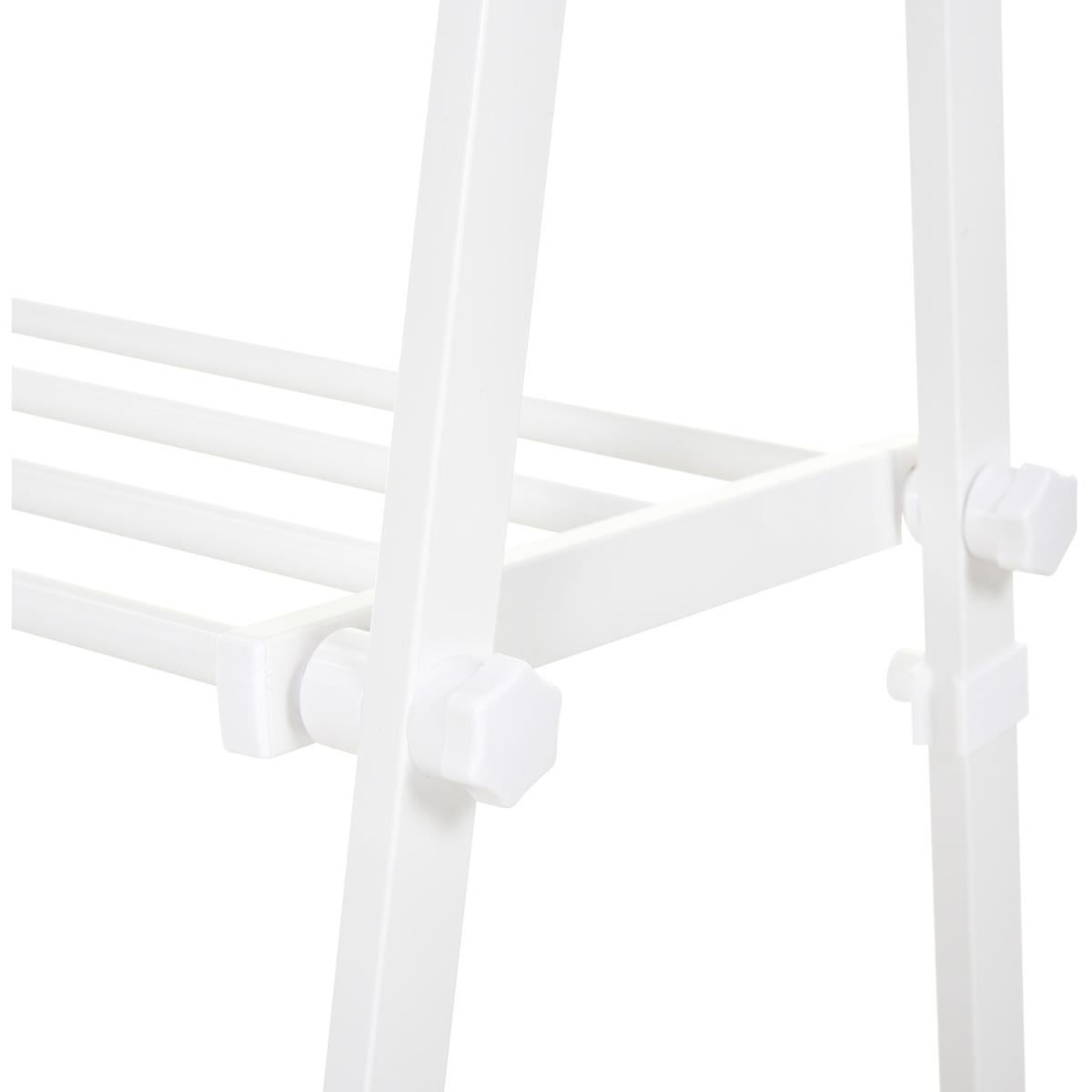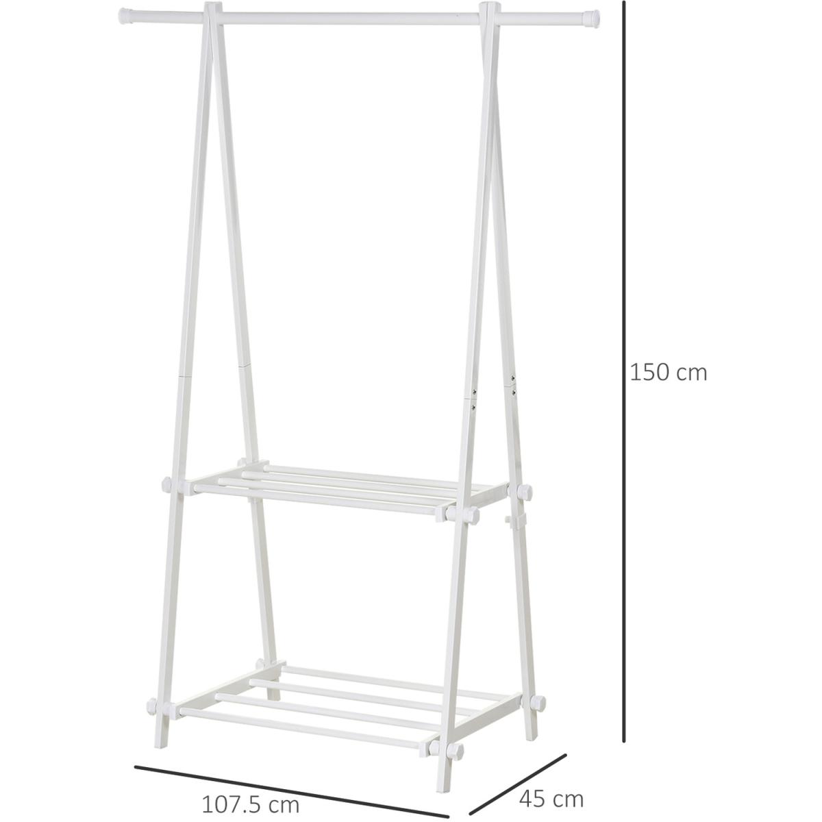 Keep your clothes neatly organised thanks to this rail from HOMCOM. Powder-coated steel forms the frame for a tough and reliable structure that can hold up to 20kg, and its 'A' shape promotes balance even when fully loaded. It's made with two slatted shelves on the bottom for extra storage and is finished with short legs for extra stability. Fresh white colour for elegance.