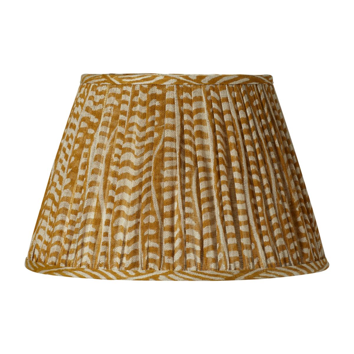 A simple abstract lampshade featuring a fun geometric design, block printed by hand. As this lampshade has been hand-printed, there may be subtle differences in colouration from piece to piece. 45cm Pattani Eclipse Lampshade - Mustard