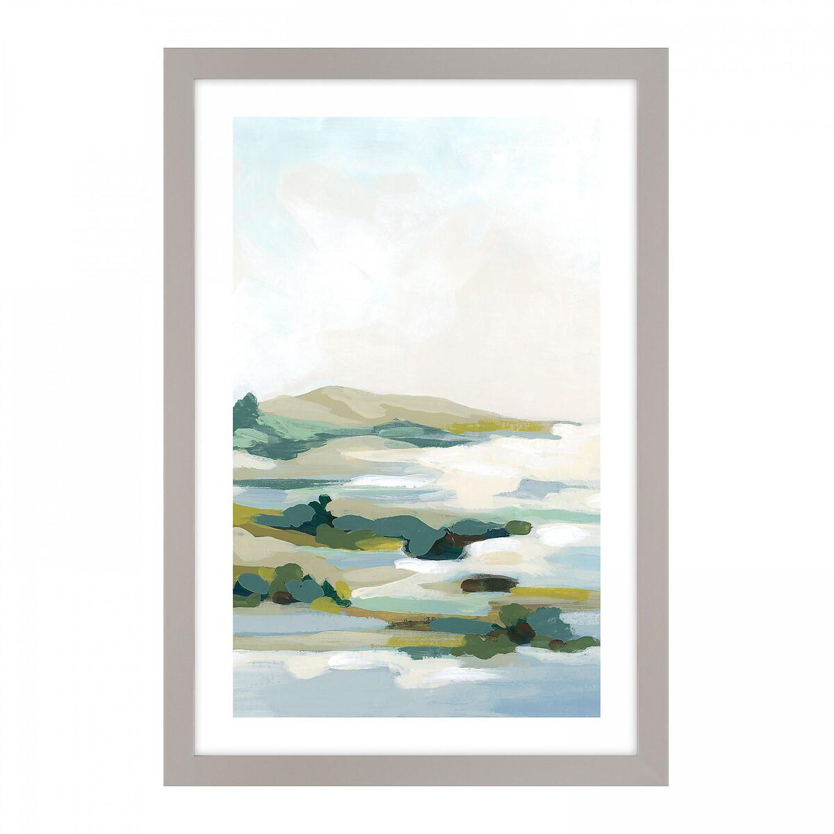 A contemporary view of a rural landscape. Abstract movement forms the foundations of the terrain. There is an aura of spring. An assortment of greens and blues create a calming atmosphere. The sky is filled with fresh air while the clouds move steadily across lush green land. Presented on textured paper. Framed and glazed. This product will be dispatched by one of our trusted suppliers. You’ll be contacted by their selected courier about your delivery. GALLE01