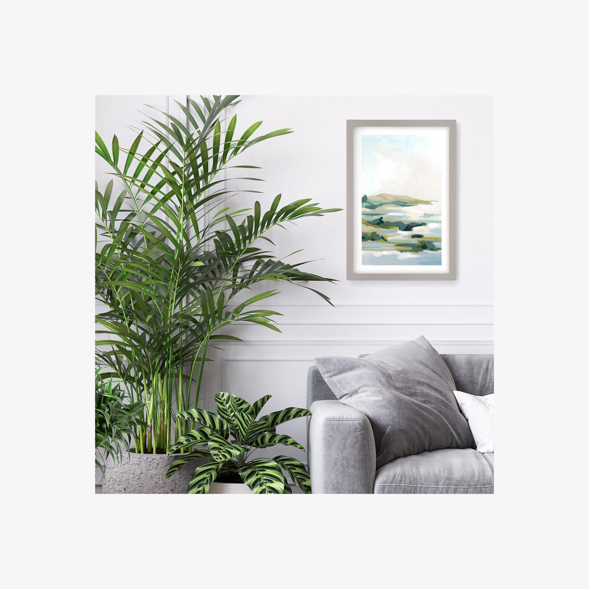 I love this piece for its clean, modern aesthetic that works beautifully in minimalist or contemporary interiors. The 47x69cm size makes it a versatile choice for above sofas, sideboards, or to create a focal point on a feature wall. It pairs well with neutral tones but can also be a fresh contrast in more colour-rich schemes. For styling tips, consider framing it with sleek, understated surrounds to keep the focus on the artwork, and complement it with leafy greenery or textured textiles to add warmth and depth to the space. It’s a practical, stylish way to introduce a calming, artistic element into any room.