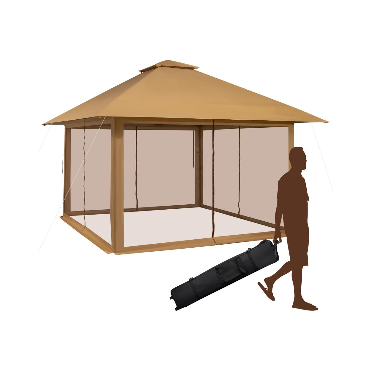 Enjoy optimal comfort with the portable gazebo tent! If you want a tent that provides both shade and ventilation, our outdoor gazebo will be a good choice. The super large canopy provides 16 sq. m of shade, enough for 10 people to move freely. Vented top with mesh ensure you stay cool and comfortable. In addition, 4 zippered removable mesh walls help promote ventilation and keep unwelcomed guests out. The canopy is made of waterproof, tear-resistant oxford fabric and features a layer of premium PU coated silver that will provide you with UV50+ protection and 500mm waterproof rating. For your convenience, you only need to push the central lock to unfold it in seconds. And all the accessories can be packed in the included carry bag. The wheeled carry bag makes it easy to move the gazebo tent outdoors. The gazebo is made of strong and durable metal construction with additional reinforcement rods to ensure higher stability. Also, the 4 wind ropes and 24 stakes help the gazebo stay stable outdoors. So whether you need to hold a small commercial event, concert or party outdoors, this pop-up canopy is a great choice!