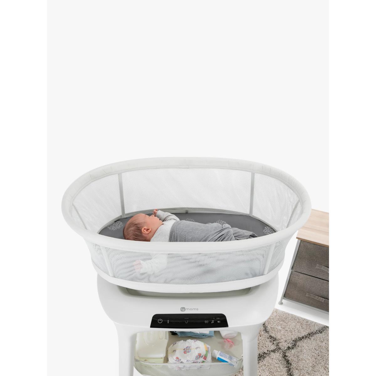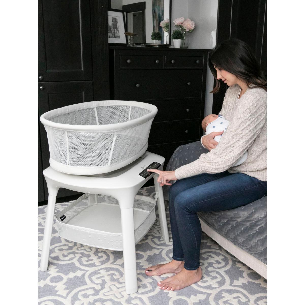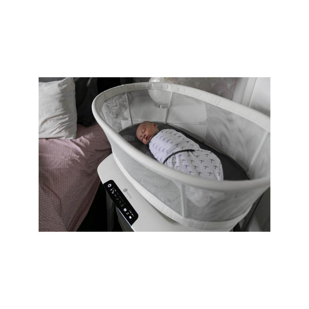 This 4moms Mama Roo sleep bassinet set includes a bassinet, a waterproof mattress and a fitted sheet. The design offers a firm, flat sleep surface with mesh sides for visibility and airflow. 5 unique motions - car ride, kangaroo, tree swing, rock a bye, and wave - are included to soothe and improve sleep. Key features: 5 speeds Timer to help establish a bedtime routine 4 white noise options: ocean, fan, shh, and rain Bluetooth-enabled control all features via the 4moms app Adjustable height Sheet is machine washable. The bassinet mattress, fabric and mesh can be spot cleaned using mild soap and warm water.