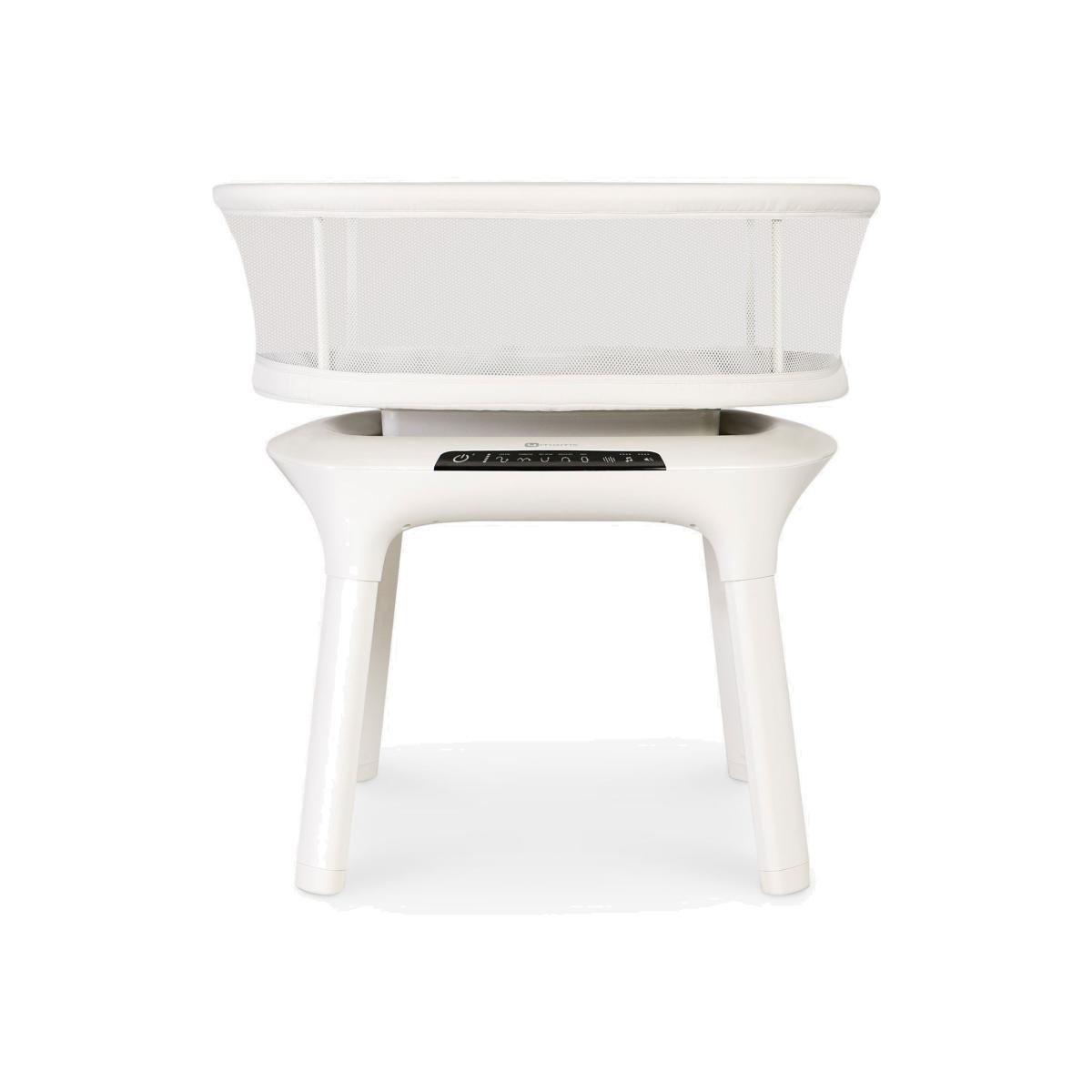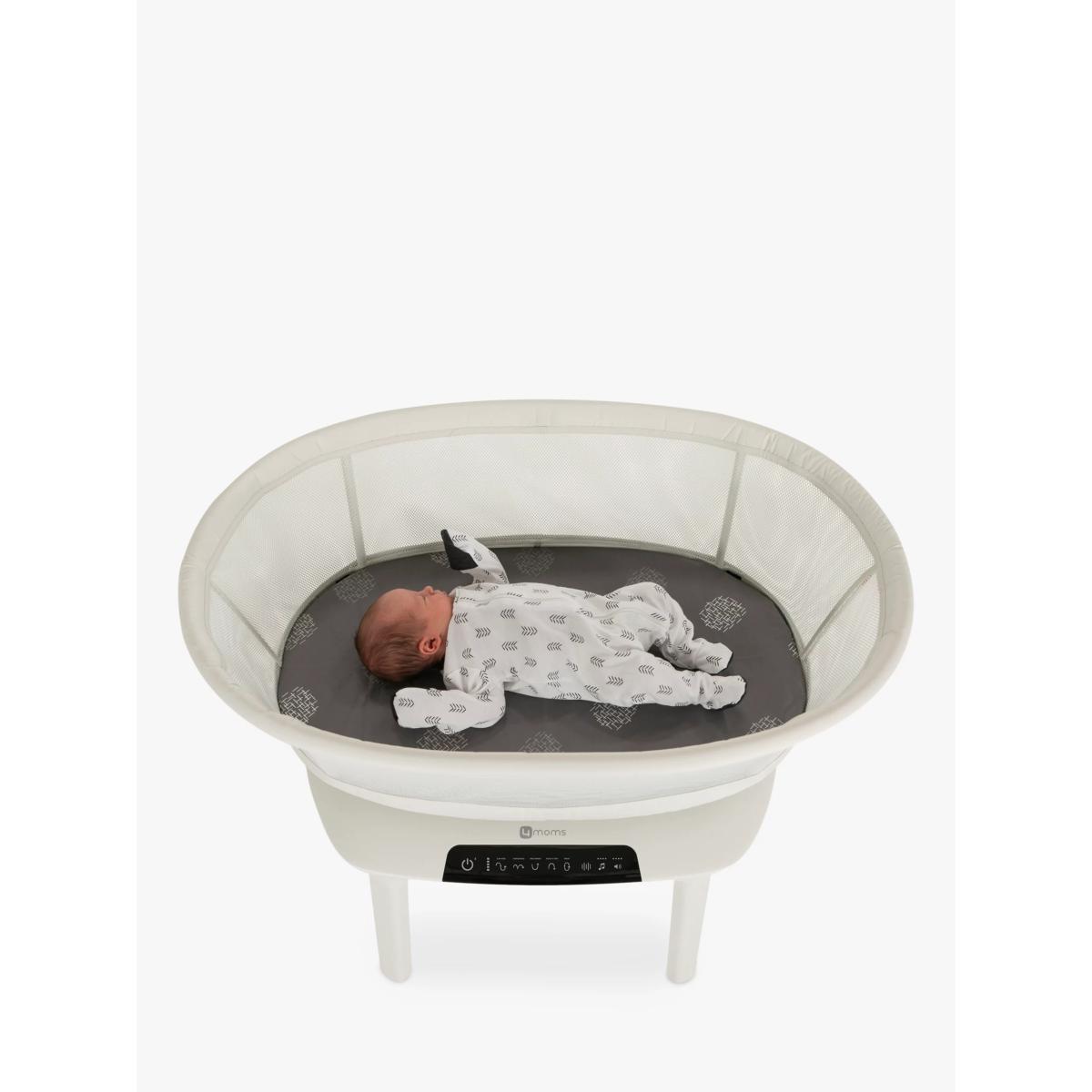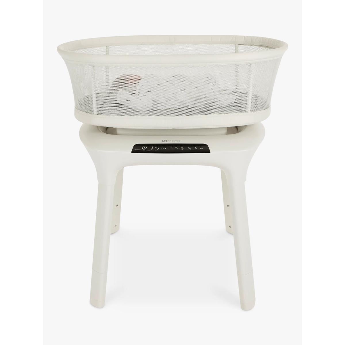 This 4moms Mama Roo sleep bassinet set includes a bassinet, a waterproof mattress and a fitted sheet. The design offers a firm, flat sleep surface with mesh sides for visibility and airflow. 5 unique motions - car ride, kangaroo, tree swing, rock a bye, and wave - are included to soothe and improve sleep. Key features: 5 speeds Timer to help establish a bedtime routine 4 white noise options: ocean, fan, shh, and rain Bluetooth-enabled control all features via the 4moms app Adjustable height Sheet is machine washable. The bassinet mattress, fabric and mesh can be spot cleaned using mild soap and warm water.