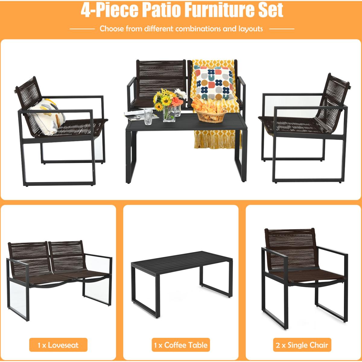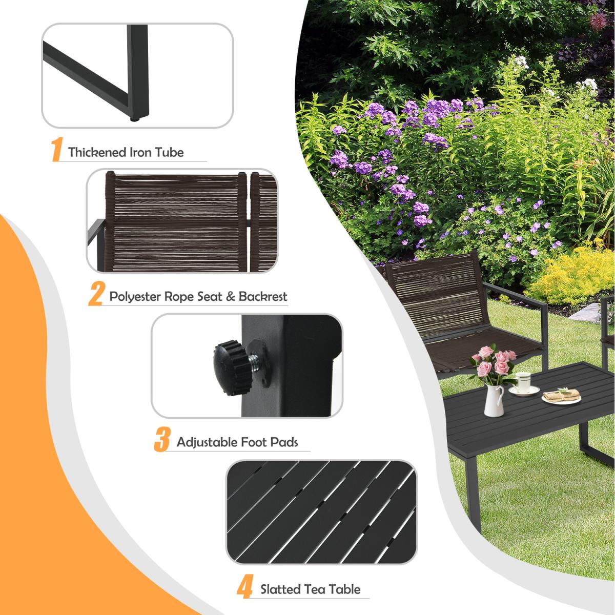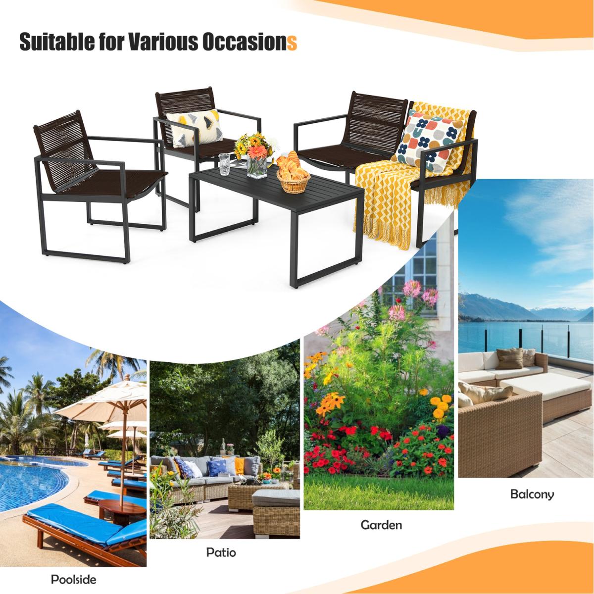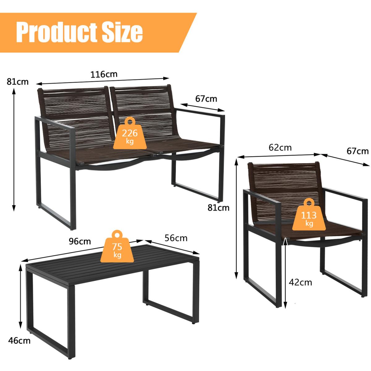 The 4 pieces of patio furniture set will provide you and your family with a comfortable space for conversation, reading or other activities. What is more, you can put this modern conversation sofa set in the backyard, poolside or balcony as you like. The patio conversation set is made of premium steel and durable polyester, which has a large load-bearing capacity and can be used for a long time. Equipped with ergonomic designed backrest and armrest, the patio bistro set can provide you with more comfort. In addition, each piece in our set is independent, so it can be rearranged according to your preferences. This outdoor furniture set can perfectly match with various home styles and is the perfect complement to your house.