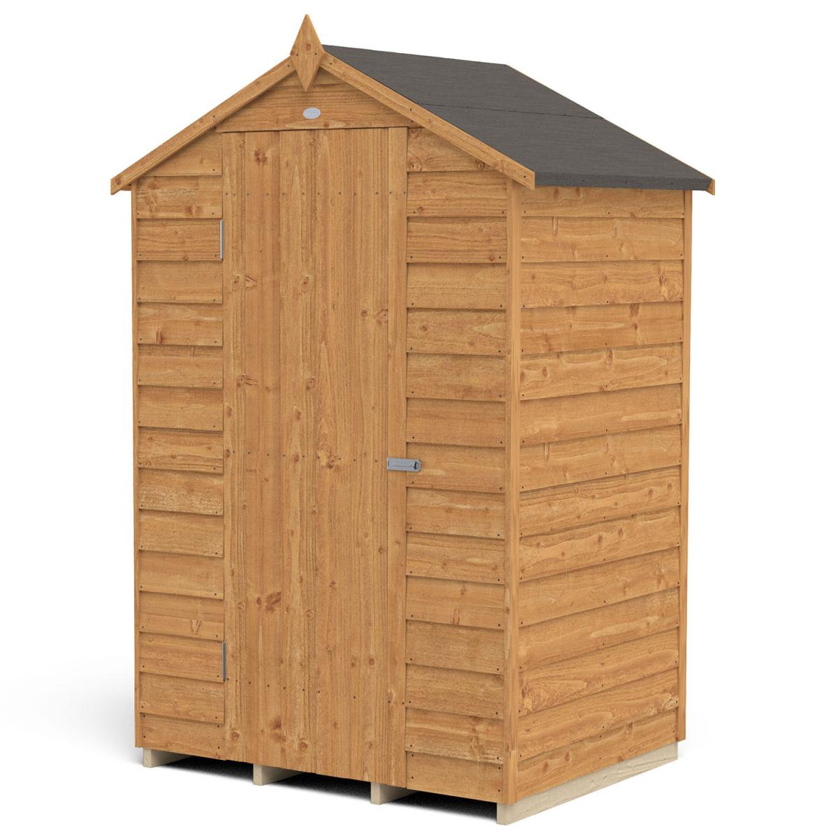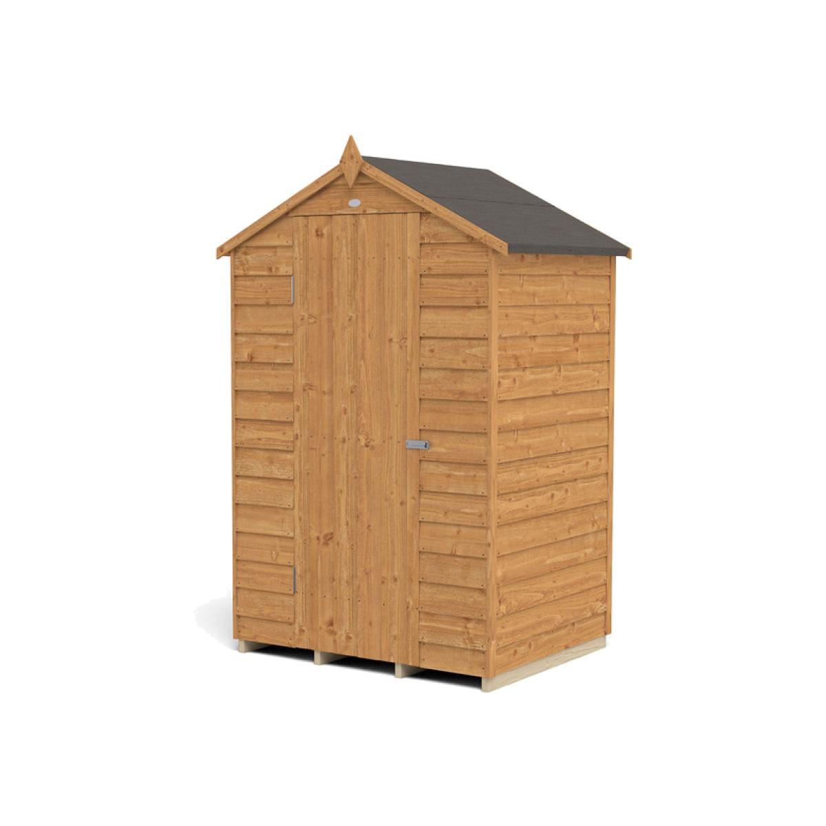 If you are looking for a compact shed to store away gardening equipment, the 4x3 Overlap Dip Treated Apex Shed is an excellently compact option. The traditional apex roof, smooth-planed barge boards and decorative finial ensure this shed will look great in any garden. It is perfect for positioning against a wall or in a corner, and the shed's improved design features smaller sections, making it easier to handle and allows quick and easy assembly. This shed is constructed with straight cut boards that overlap to give flexibility, allowing natural movement of the timber during the changing seasons and to aid water run-off. The roof of this Apex Shed is made from hard wearing sheet material, finished with black sand felt, aiding even more in waterproofing and adding an attractive finishing touch. Rather than the more common OSB, the flooring is made from pressure treated solid timber - its superior strength allows for the storage of heavier items like lawnmowers or bags of compost. With a door that is braced with double 'Z' framing and secure hidden hinges, this robust shed will keep your possessions safe and secure. A fitted hasp staple and latch can be used with your own padlock to add even more security. The Dip Treatment that has been applied helps this shed stay resistant to rot and fungal decay, and also gives it its beautiful golden brown colour. With such an attractive and robust build, this 4x3 Overlap Dip Treated Apex Shed is the sure choice for keeping your garden neat and tidy. Installation by a team of professionals is available for an extra yet affordable price, and all fittings and fixtures are included with this summerhouse, as well as easy-to-follow instructions are included for any DIY hobbyists who want to really make this shed their own by building it themselves.