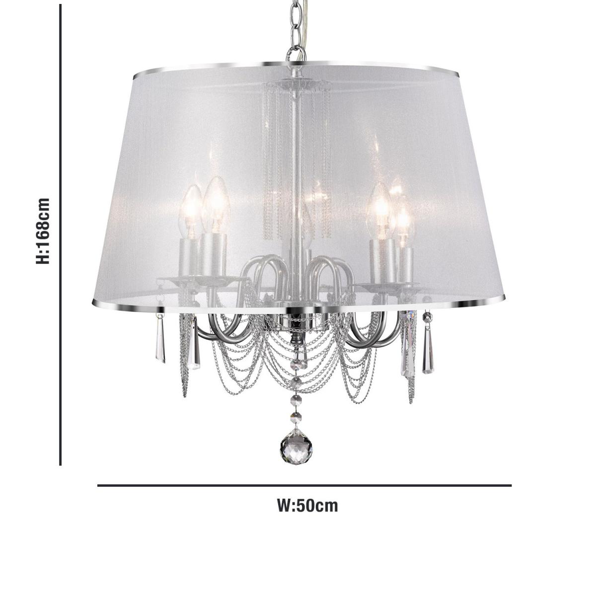 Dimensions H168 x W50 cm. The Venetian Chrome 5 Light Chandelier is a stunning light and makes a striking centerpeice for any contemporary bedroom. Adorned with a white shade crystal detailing and chain links this luxury chandelier will complete your room. The large tapered polycarbonate shade gives a tantalising glimpse of the curved chrome finish arms and 5 candle style light fittings within. The fitting is adorned with beautiful chain link detail with crystal drops and decoration that hangs below the shade. Features. 5 Light ceiling light White voile shade. Chain link detailing. Chrome curved arms Crystal and chain adornments Assembly required..