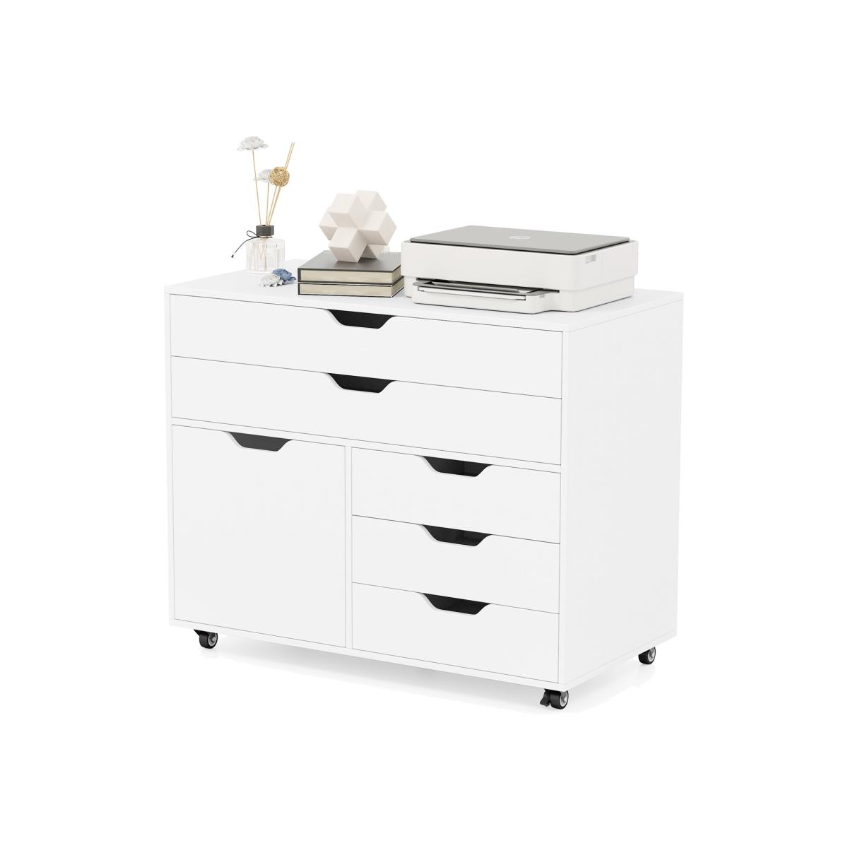A versatile mobile storage solution to enhance organization in any living space. Featuring a large cabinet and 5 pull-out drawers, the mobile file cabinet is ideal for organizing a variety of items, such as books, printer, stationery and potted plants. For longevity, thickened board accounts for reliable structure to hold your items. Why choose us? Our 5 smooth rolling casters (2 with brakes) are better than 4 light casters without locks. Whether used as a storage organizer or file cabinet, the unit will undoubtedly be a charming complement to your study, living room, and office, etc.
