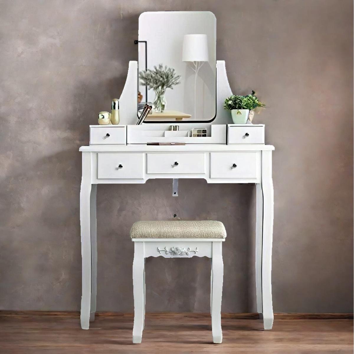 5 Drawer White Dressing Table With Rectangular Mirror And Stool - White