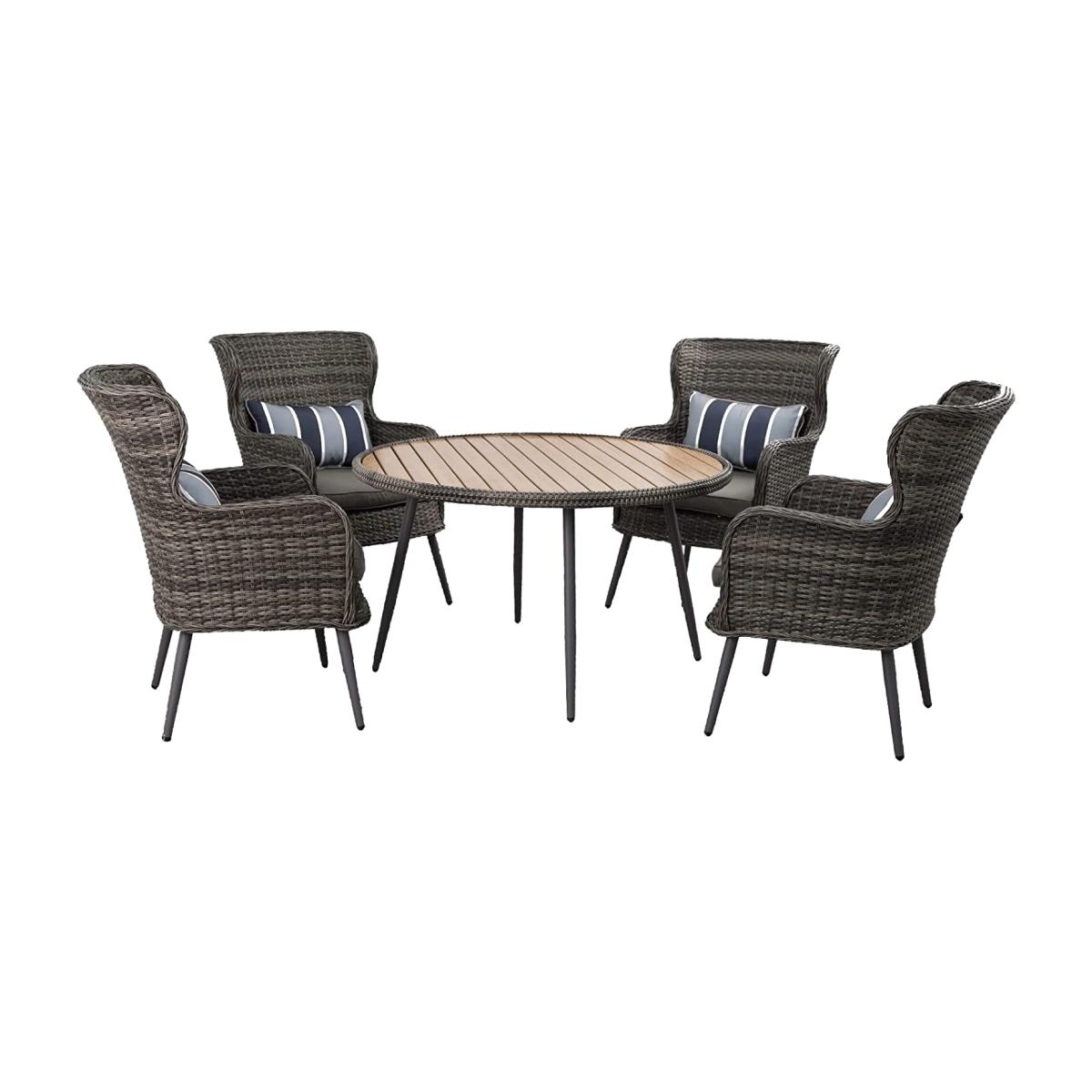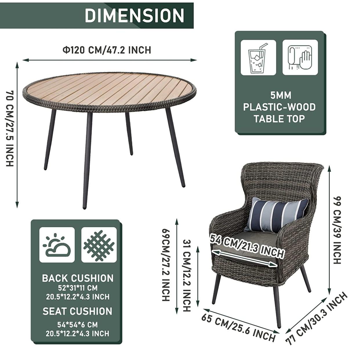 This five-piece rattan dining set is a vibrant choice for adding a pop of colour to garden or patio areas. The sunny yellow table top brings a cheerful vibe, making it perfect for casual outdoor dining or relaxed weekend gatherings. I love how the rattan chairs with their comfortable armrests and striped cushions can work equally well in contemporary or more traditional outdoor spaces. To style it well, consider pairing the set with matching yellow accessories or colourful outdoor cushions for extra personality. It also works nicely with neutral or earthy-toned surroundings to let the yellow really stand out-ideal for creating an inviting and lively outdoor dining corner.