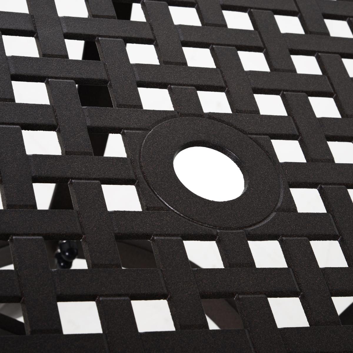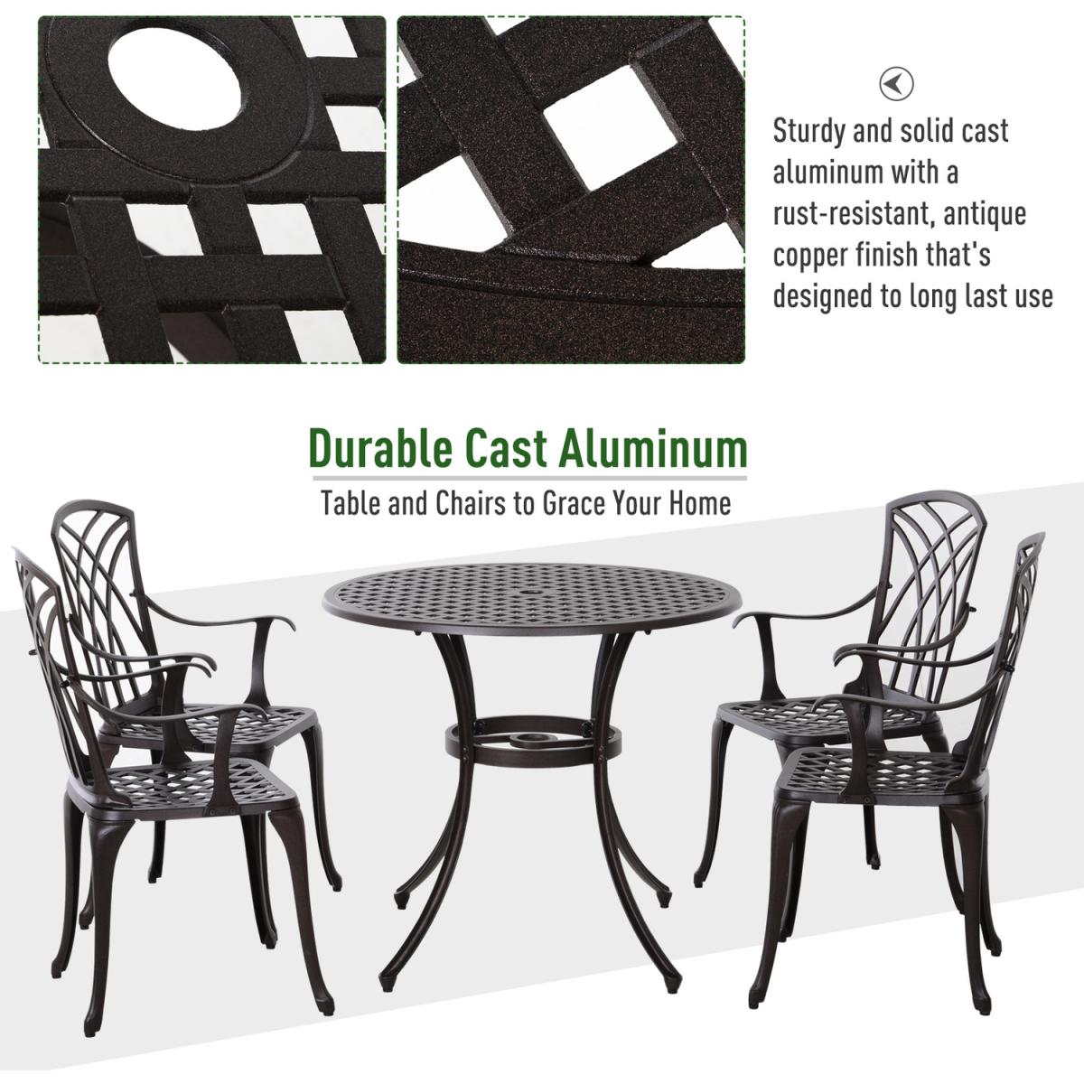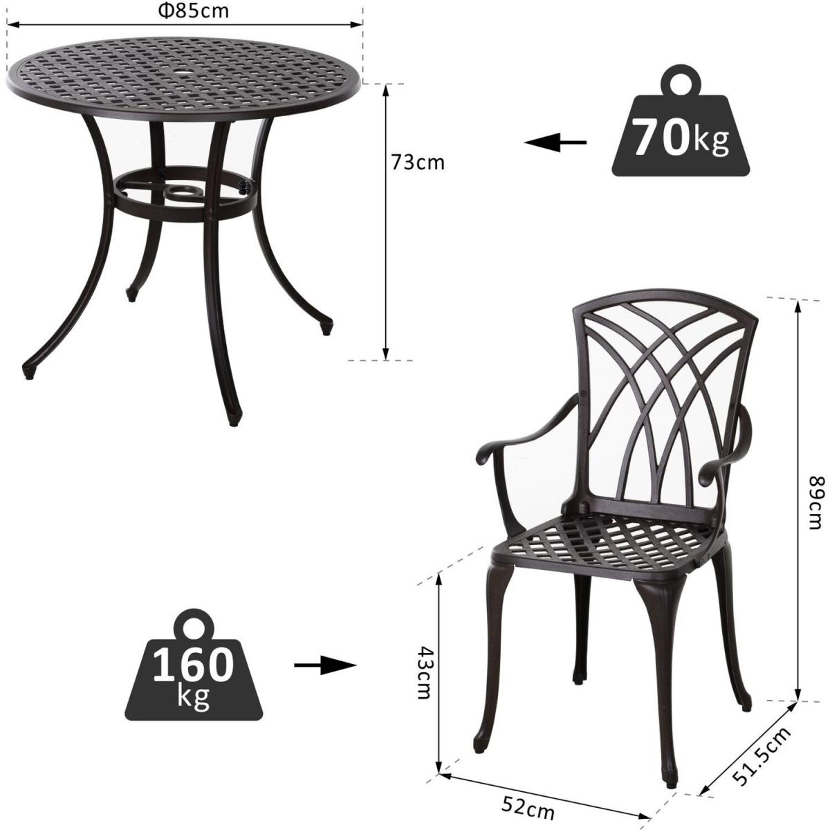 No matter how short you are on space in your home and outdoors, this five-piece Stamford set from Outsunny will give you the perfect spot to dine and relax. It's formed of four bistro chairs and a matching table, with cast aluminium forming the frame of all three pieces to ensure they are sturdy and tough, as well as being resistant to rusting and mild everyday wear-and-tear. Round in shape, the table features a middle hole to keep a sun parasol securely in place, with the back of the chairs showcasing a cut-out design for an attractive finish whether seated or not. Ideal for flats and apartments with balconies.