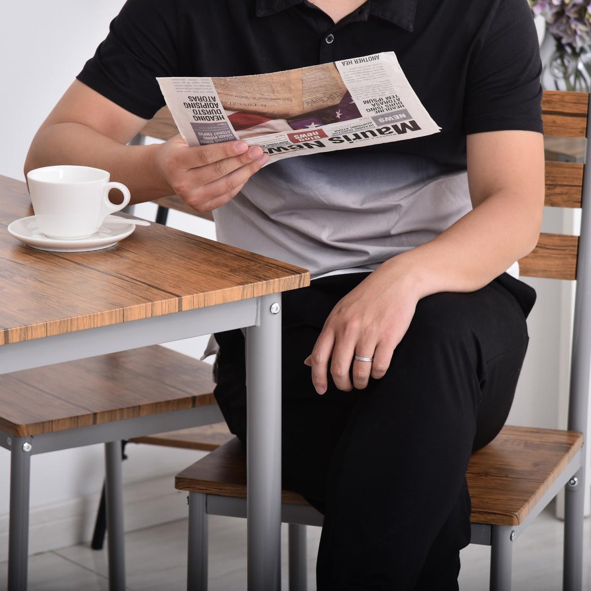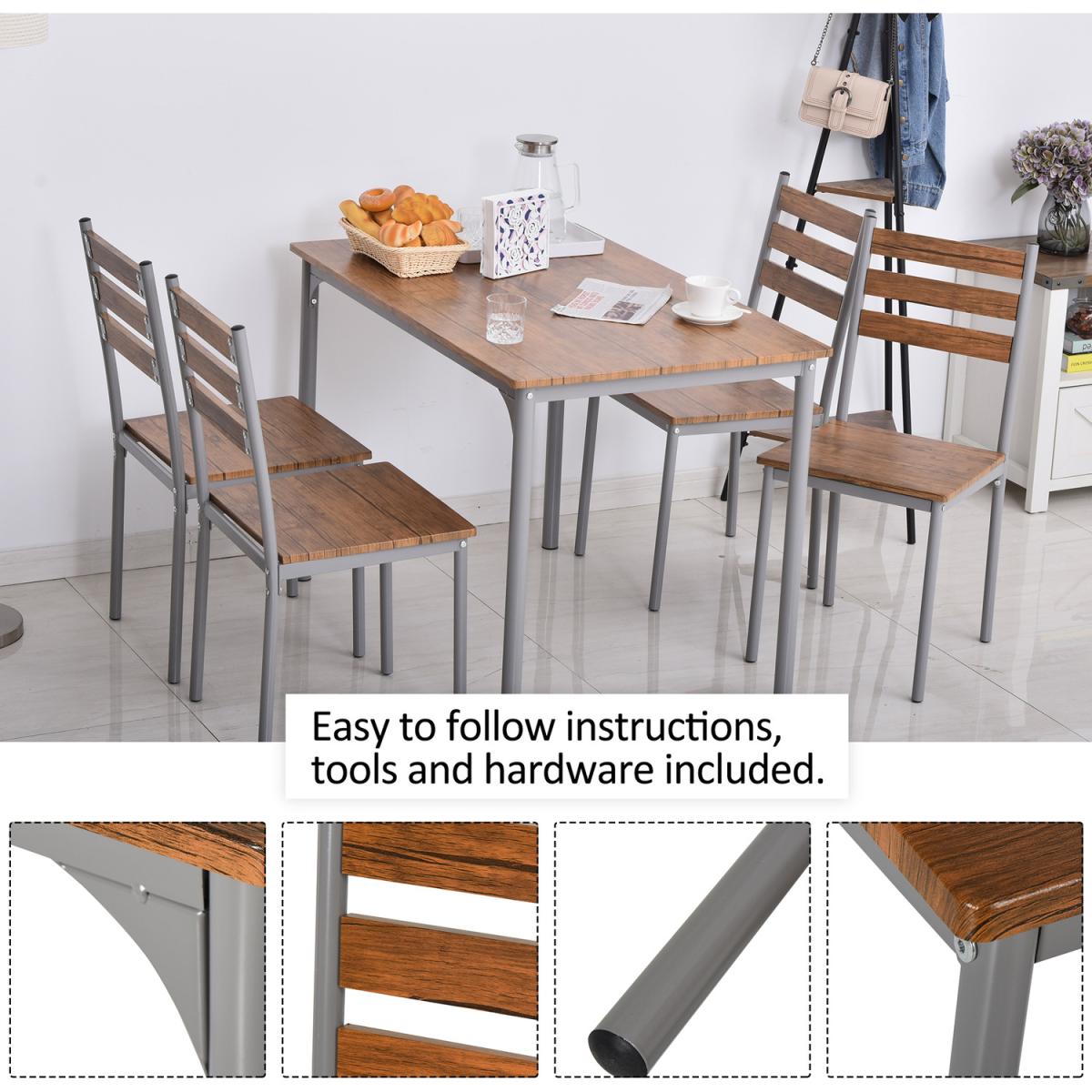 Keep your morning and evening dining times simple, with a touch of style - make this five-piece set the backdrop of it all. Comes with a table and four chairs, so there's room for the whole family to sit together. The frame of each piece is made from powder-coated steel for strength and durability, with MDF panels as the tabletop, seat and chair back panels so you can sit and dine with full support. The panels are finished in a wood effect for a classic and beautiful furniture look. A piece you can easily bring into the home and use as much as possible.