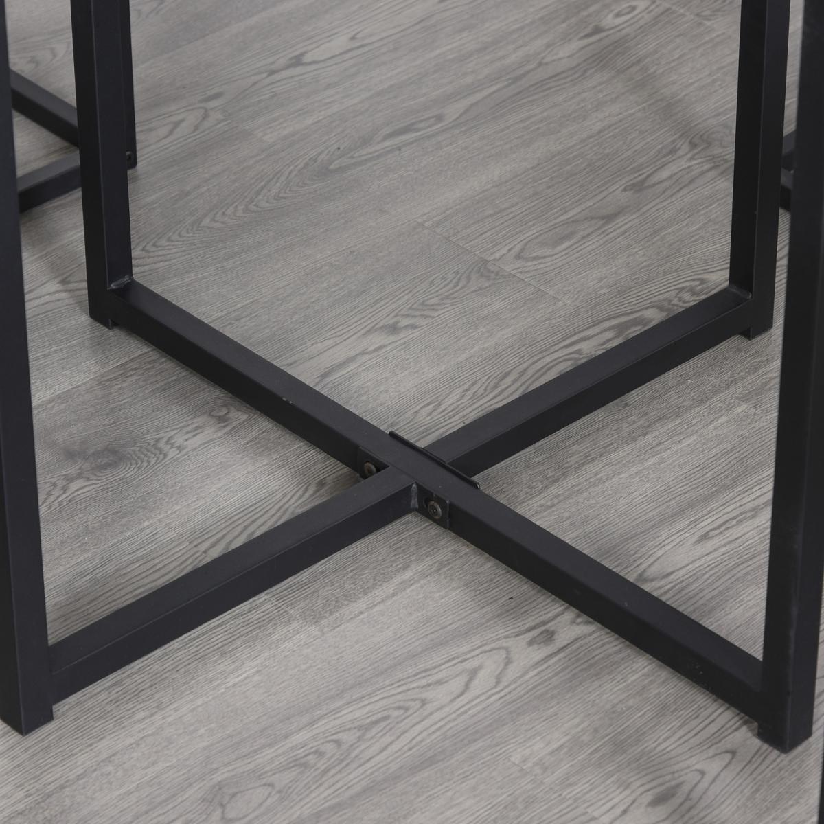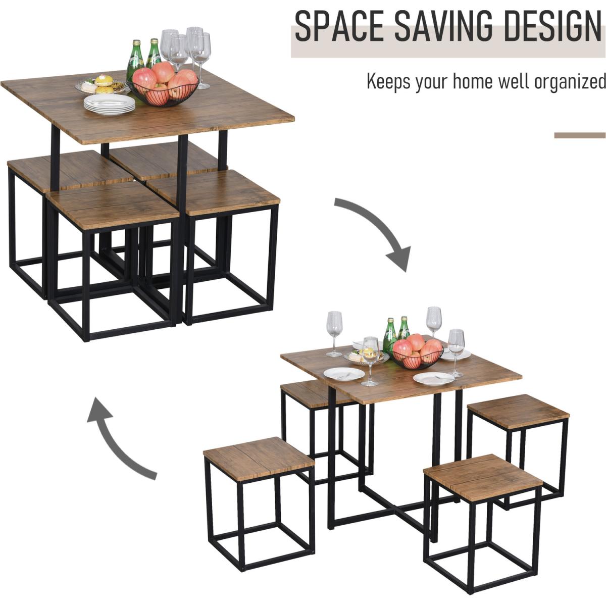 Bring family and friends together in style with this bar table set from HOMCOM. It's formed of five pieces - four square stools and a tall square table, giving room to sit, dine and relax. Every frame is constructed from solid steel for strength, and crafted into a modern and cool boxy shape. Black in colour, the frame provides a cool contrast to the wood effect of the MDF seats, whilst still keeping a classic tonal palette to suit every style of decor. It's finished with a melamine coating on the seats for a smooth feel and protection against light marks and scruffs. Each chair can be tucked in beneath the tabletop when not in use to save space.