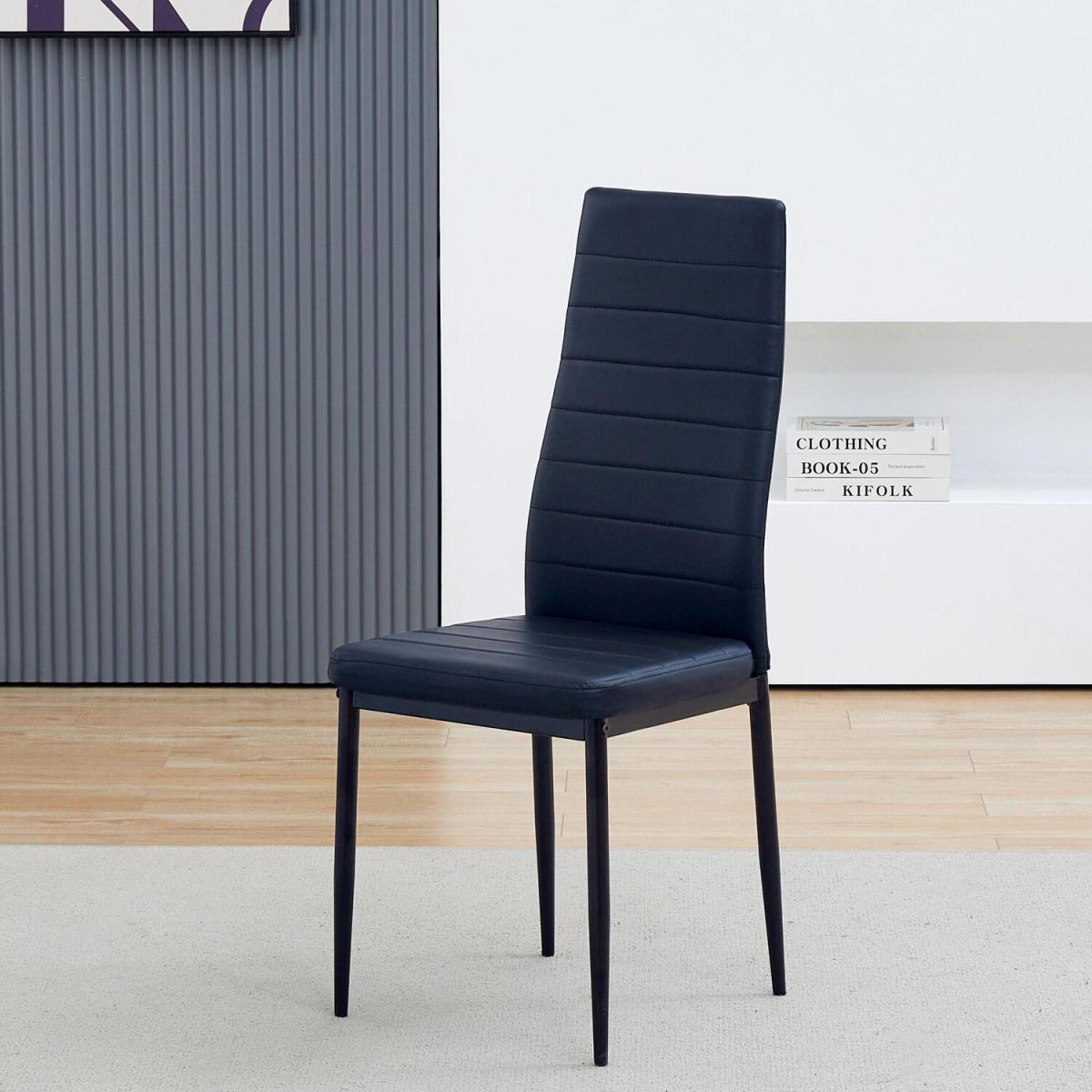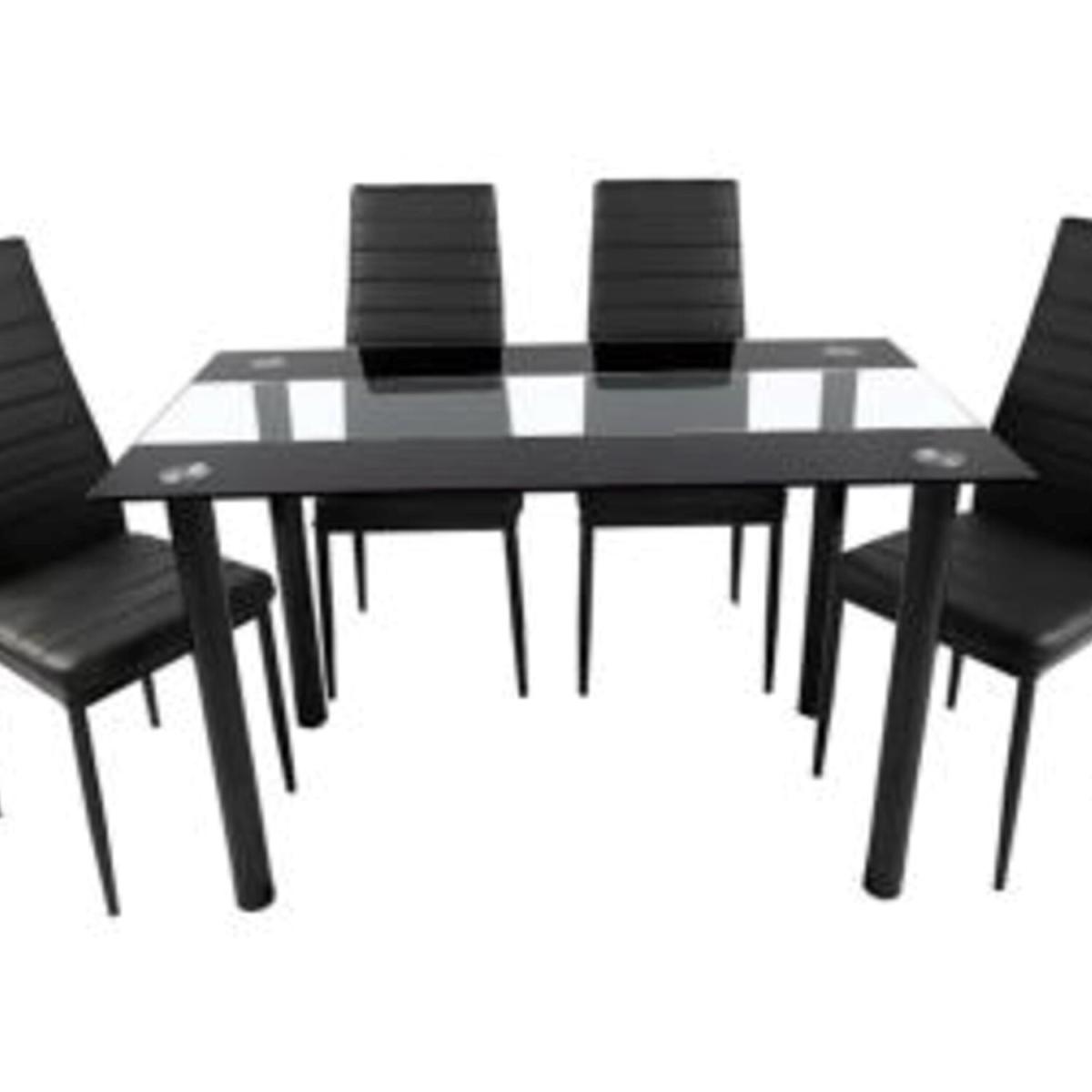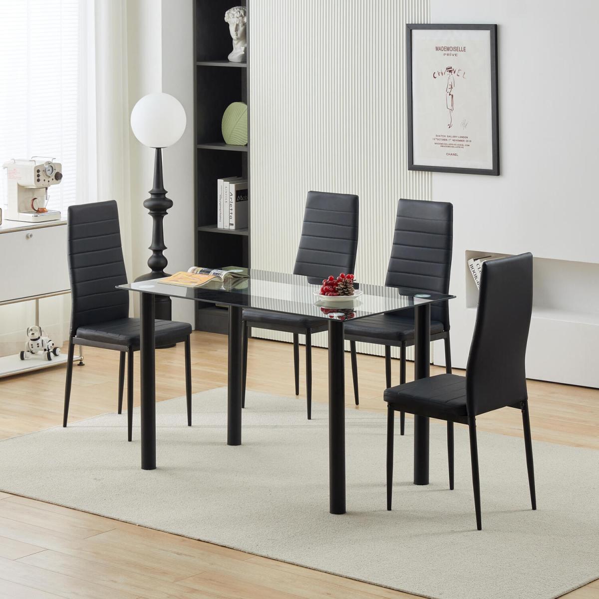 Transform your dining area with this stunning dining set, the table is the height of contemporary style and features sleek tempered glass combined with brushed chrome legs that adds sturdiness to style, making this dining set durable and eye-catching. The set includes 4 chairs that are upholstered in modern black faux leather. Please be advised that all dimensions are approximate, please allow room for slight variations.