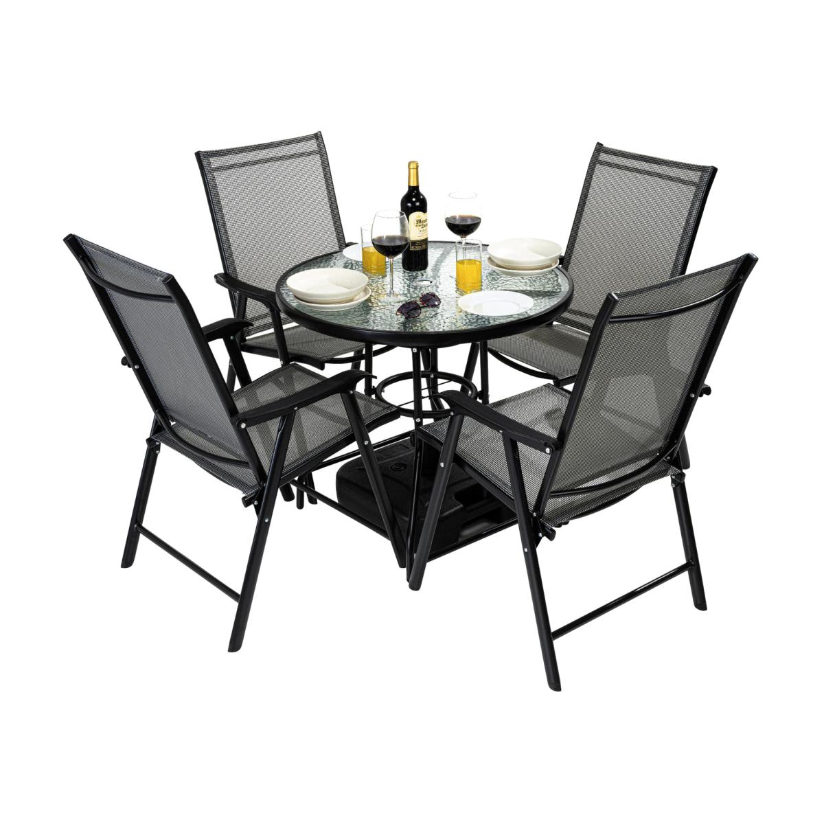 Elegant & Durable Outdoor 5 piece Dining Set. Perfect for Alfresco Dining. Upgrade your outdoor space with this stylish and hardwearing outdoor dining set, designed for both comfort and durability. Crafted from strong, powder-coated steel, the sleek matte finish not only adds a modern touch but also provides excellent resistance to the elements. The comfortable chairs are made from breathable textilene fabric, allowing air to circulate for a cool, climate controlled seating experience. Plus, they are wipe-clean and showerproof, making maintenance effortless. At the heart of the set is a toughened glass dining table, designed to seat four diners comfortably. The table also features a central hole for an optional parasol, offering shade on sunny days. Whether you're enjoying morning coffee, a family meal, or evening drinks, this elegant and durable dining set is the perfect addition to any garden, patio, or balcony. Create your perfect outdoor retreat with this premium dining set, where style meets practicality. Chair colour is Black with Grey fabric.