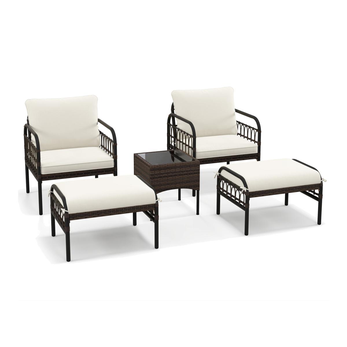 Experience endless cosiness with this 5-piece patio rattan conversation set. The chairs and ottomans are equipped with comfortable cushions filled with high-density sponges, ensuring optimal comfort. The smooth zippers on the seat and ottoman cushions make maintenance a breeze, while the fixing straps provide better fixation. The premium PE rattan surface adds an appealing and elegant touch to the set, which is also anti-fading and durable. 5 Piece Outdoor Wicker Chair Set - White