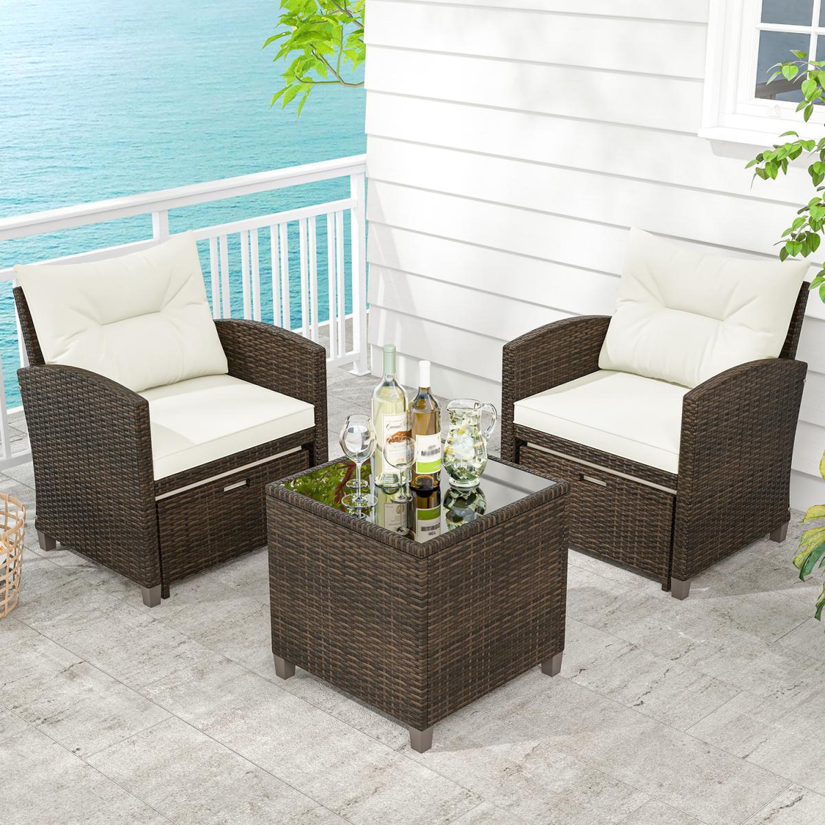 Elevate your outdoor relaxation with this elegant 5-piece patio furniture set. Crafted with built-to-last and fade-resistant PE rattan, the whole patio set adds a touch of sophistication to any space. The chairs are comfortable to sit with ergonomic backrests and curved armrests. Moreover, the cushions on the chairs and ottomans bring you more cosiness. The versatile ottomans serve as footrests, extra seats or side tables for more convenience. This 5-piece patio set combines comfort and style, creating an inviting oasis for leisure moments.