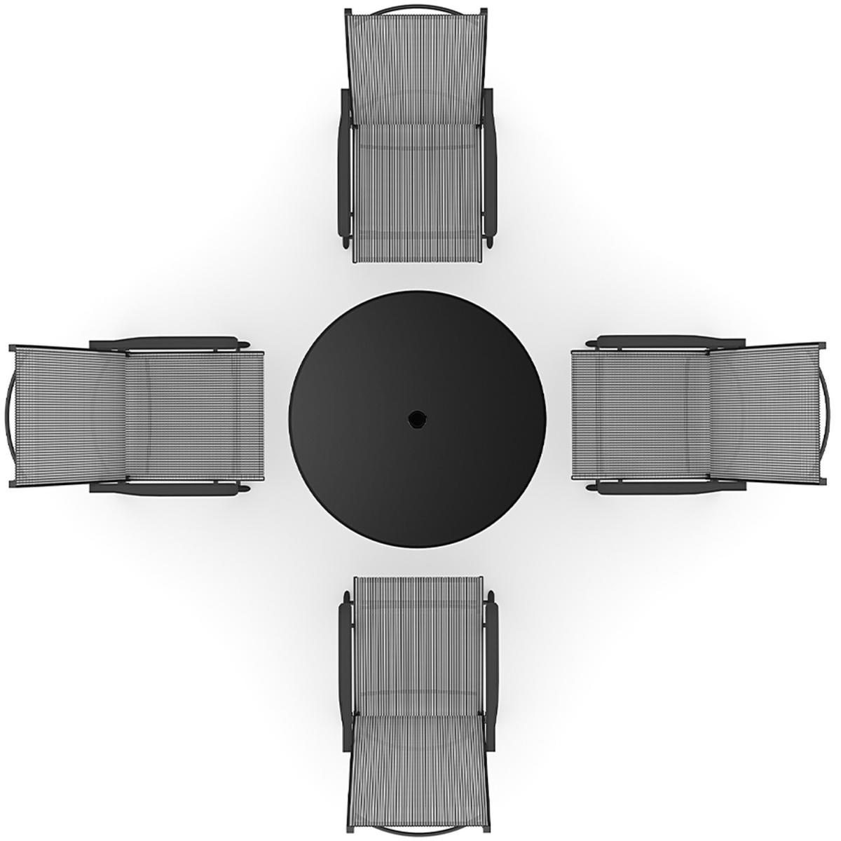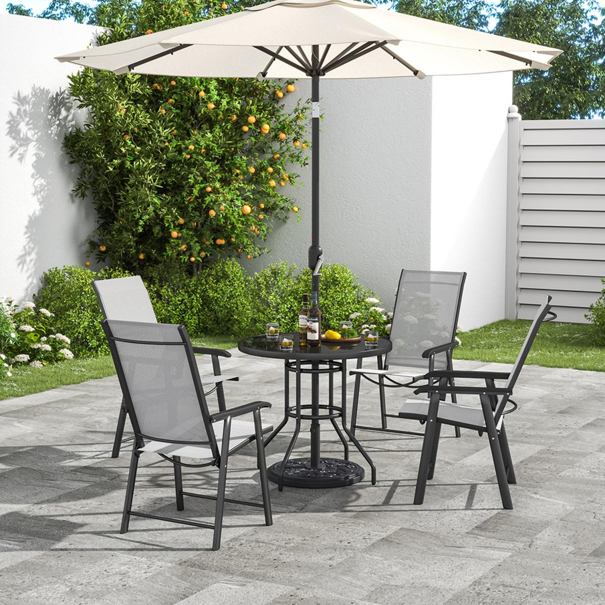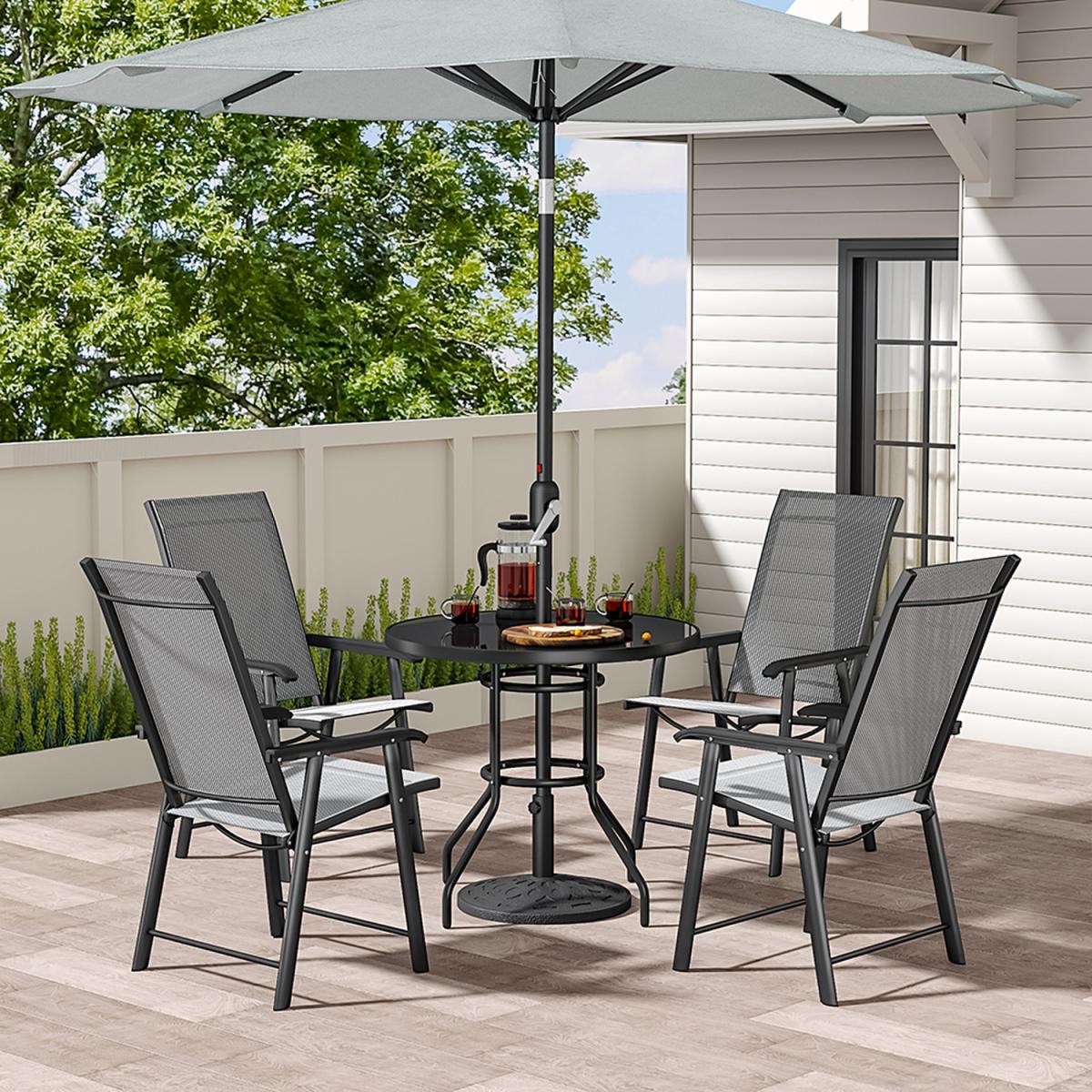 This outdoor bistro set, with its delicate appearance and high quality, can make a great experience for you. Modern and practical 5-piece patio furniture set increases a fashion style to your garden or porch. It includes a tempered table silked in black and 4 foldable chairs. There's a hole in the middle of the table, where you can place a parasol to protect you from the sunlight. In a contemporary style, it's perfect to compliment your garden or balcony.