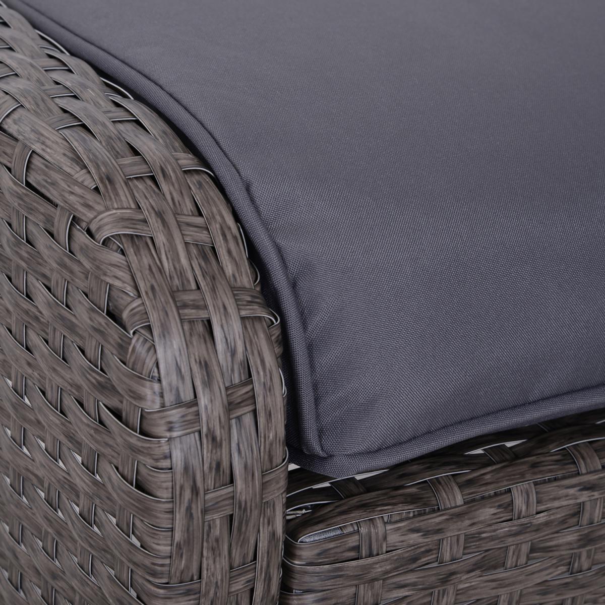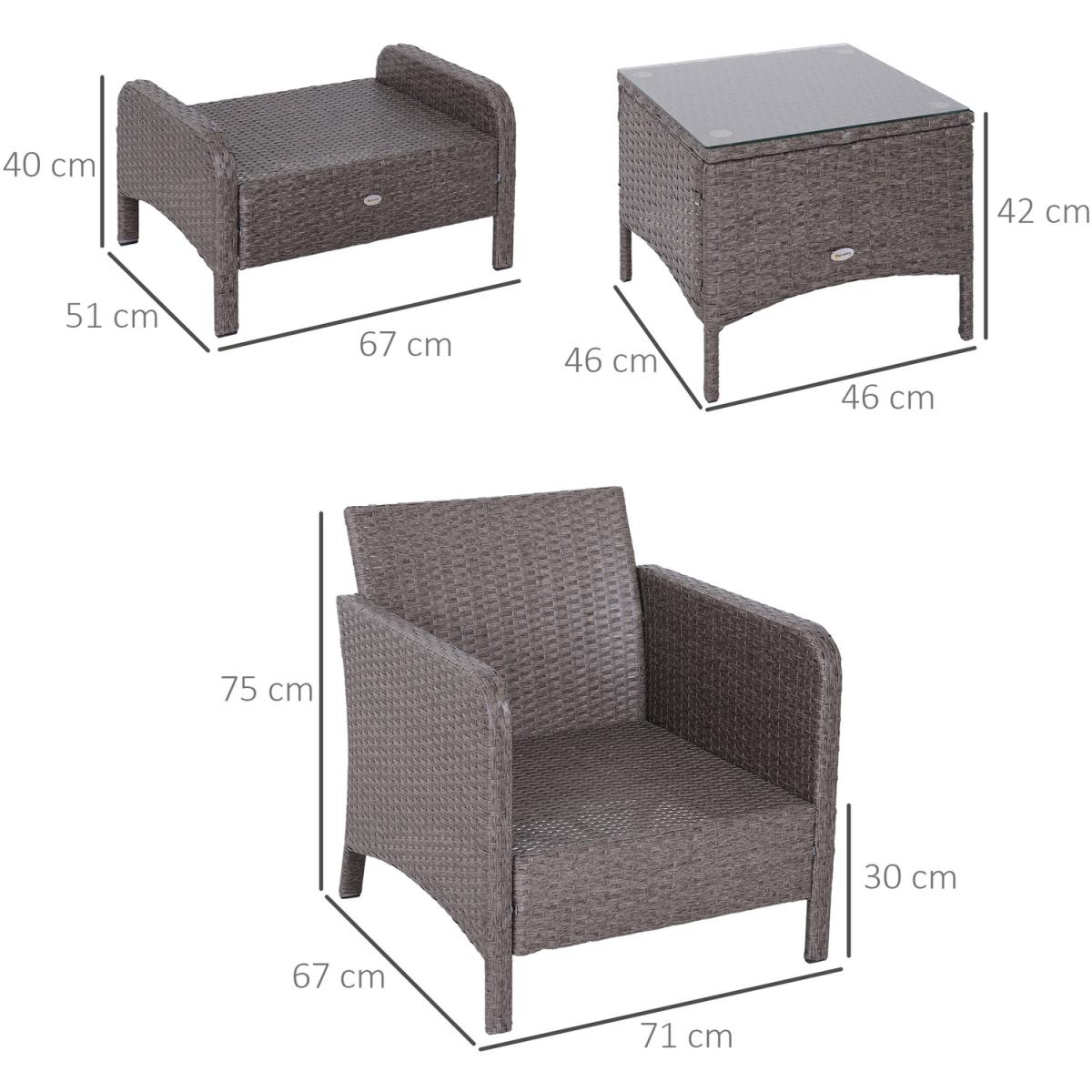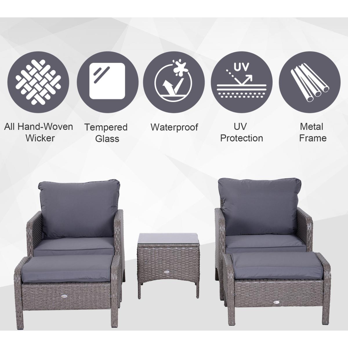 Sit back and relax in complete comfort with this rattan chair and stool set from Outsunny. Formed of five pieces, the set features two armchairs, two footstools and a matching coffee table. Made from handwoven PE rattan, each piece is weather resistant and low maintenance, with a steel frame underneath for extra support and stability. Two plush cushions on each chair ensure you'll be relaxing comfortably for hours on end, with the removable covers making them easy to take off and clean. With a tough tempered glass top, the table is also easy to clean, making this set a fantastic combination of style, comfortable and minimal hassle.