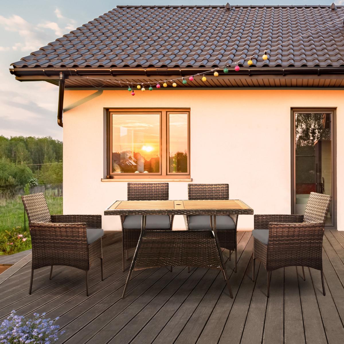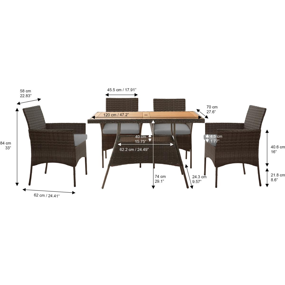 Teamson Home 5 piece patio dining set comes complete with comfortable cushions so optimum relaxation can be achieved. This set comes with 4 comfortable chairs that have high backs and armrests made from PE wicker which has been woven to show the exquisite detail. 4 easy-clean, durable cushions are included in this set. The rectangle-shaped table has been crafted in the same material as the chairs, with study black steel and rattan being a key detail. The table frame can act as a storage unit for books, magazines, cutlery, or even napkins, while the tabletop has been finished off with elegant Acacia wooden slant detail which allows rain to run through and an umbrella hole. The metal feet are topped with robust rubber safeguarding against scratches on the flooring area. This is lightweight and can be easily moved. This product is weather-resistant and is perfect for outdoor or indoor living space