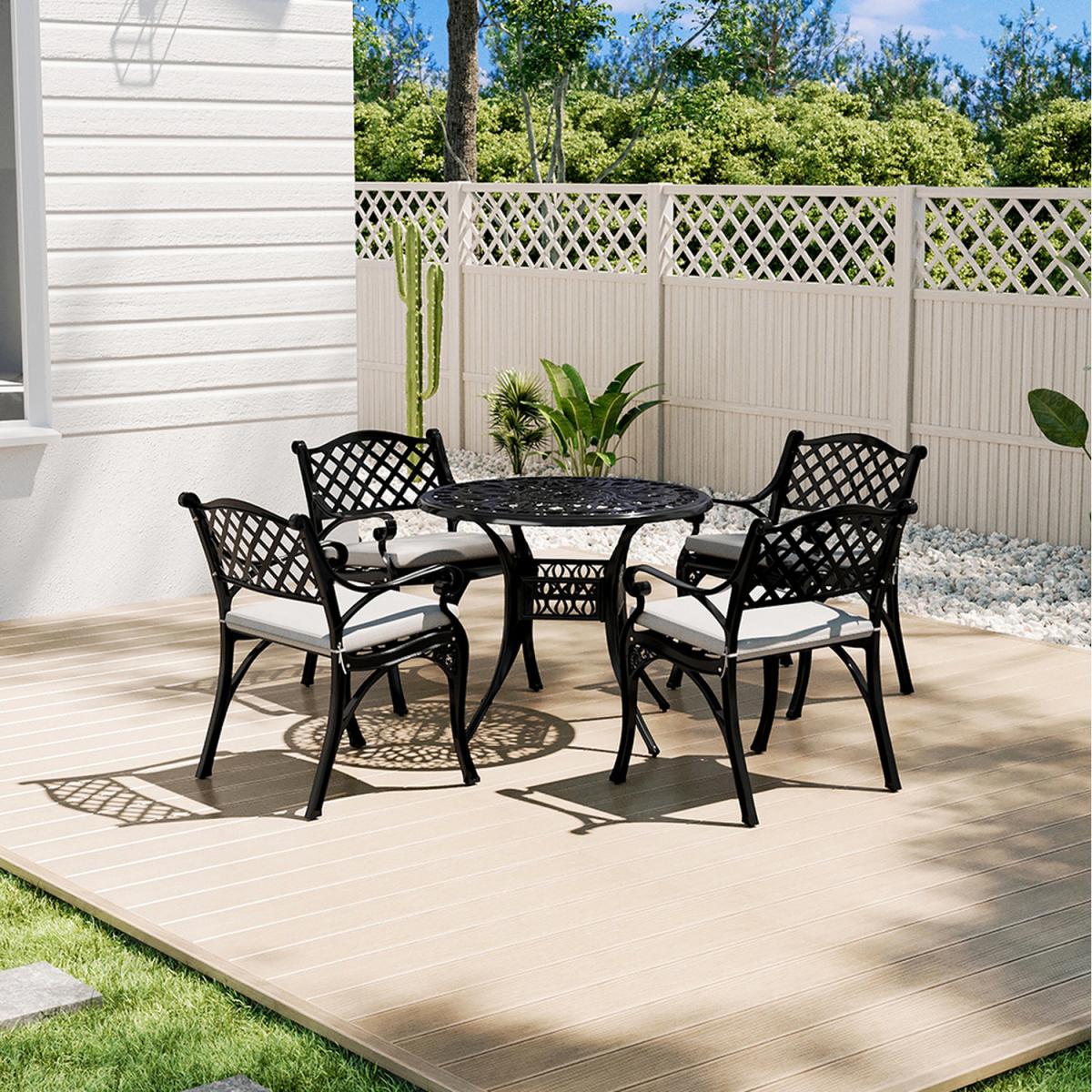 Enhance your outdoor gatherings with the Garden Sanctuary furniture set. The table showcases intricate detailing with a braided center and spiral lattice, adding elegance to your space. Constructed from durable cast aluminum for lasting use, each chair includes a thickly padded seat cushion for comfort. The table also features an umbrella hole, providing shade on sunny days. 5 Piece Retro Cast Aluminum Garden Bistro Set with Cushions - Black / 1 Table and 4 Chairs