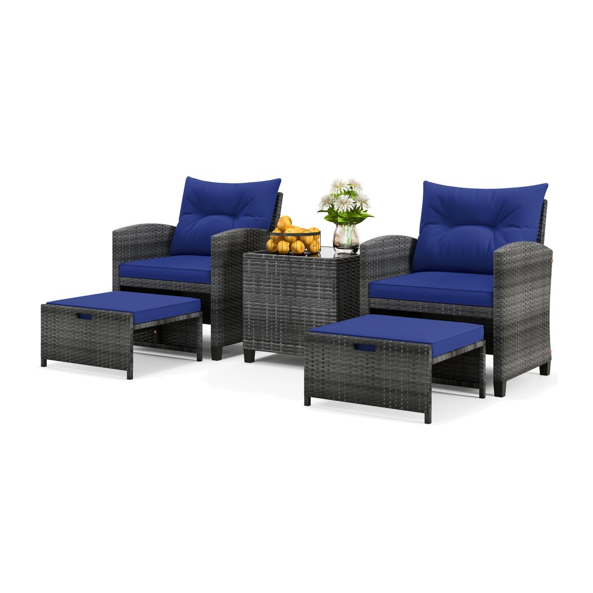 Transform your outdoor living space with our 5 piece wicker patio furniture set! Crafted from well-woven PE rattan, this outdoor conversation set is built to last and is also a charming addition to your backyard, garden, poolside, lawn, deck, or porch. The set includes 2 cosy chairs with soft sponge-padded cushions, offering ultimate comfort and relaxation. Also included are 2 ottomans with cushions, providing versatile seating options. The ottomans can be stored neatly under the chairs when not in use, helping to save space and maintain a tidy area.