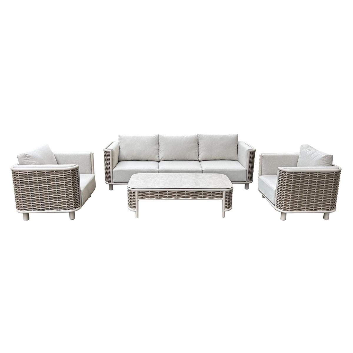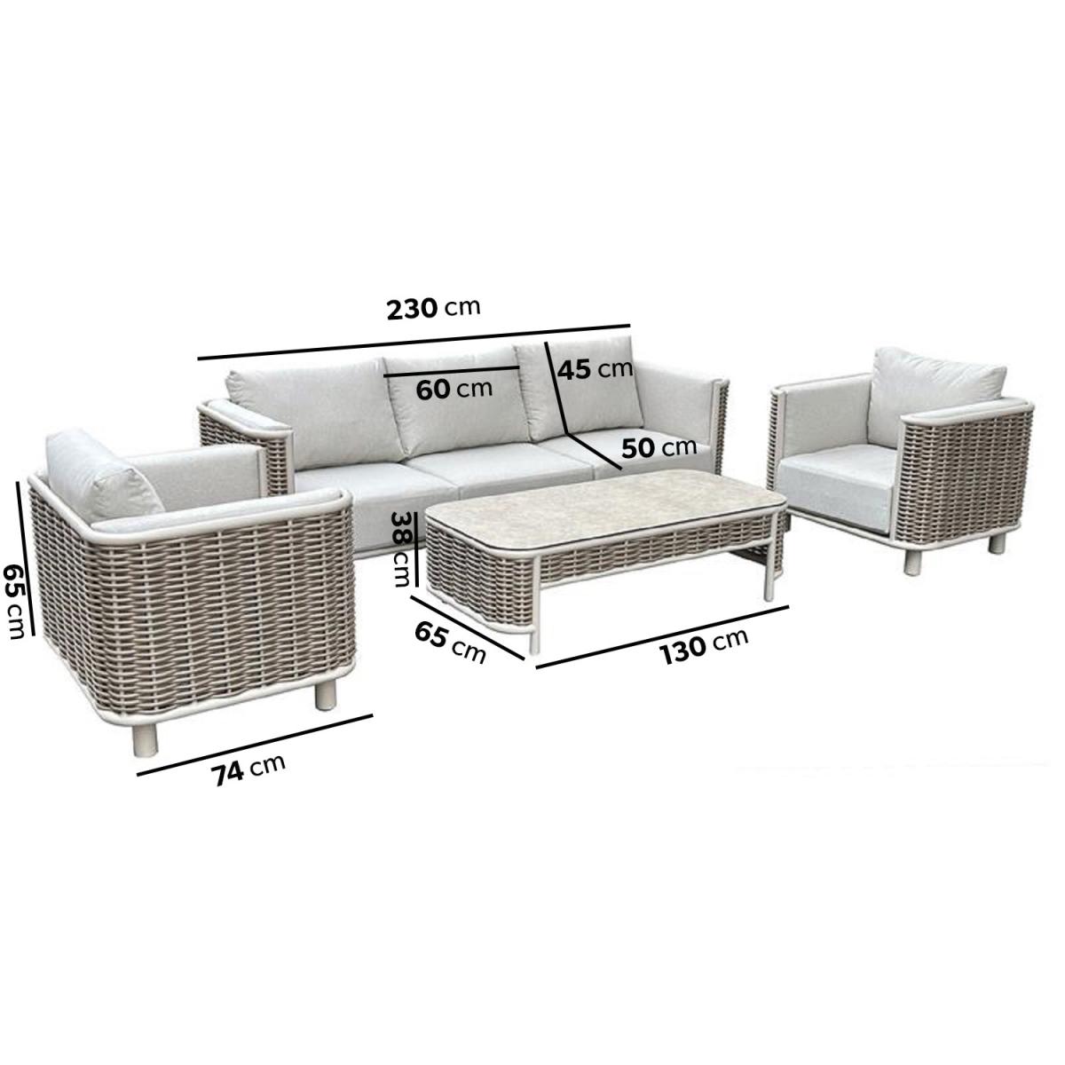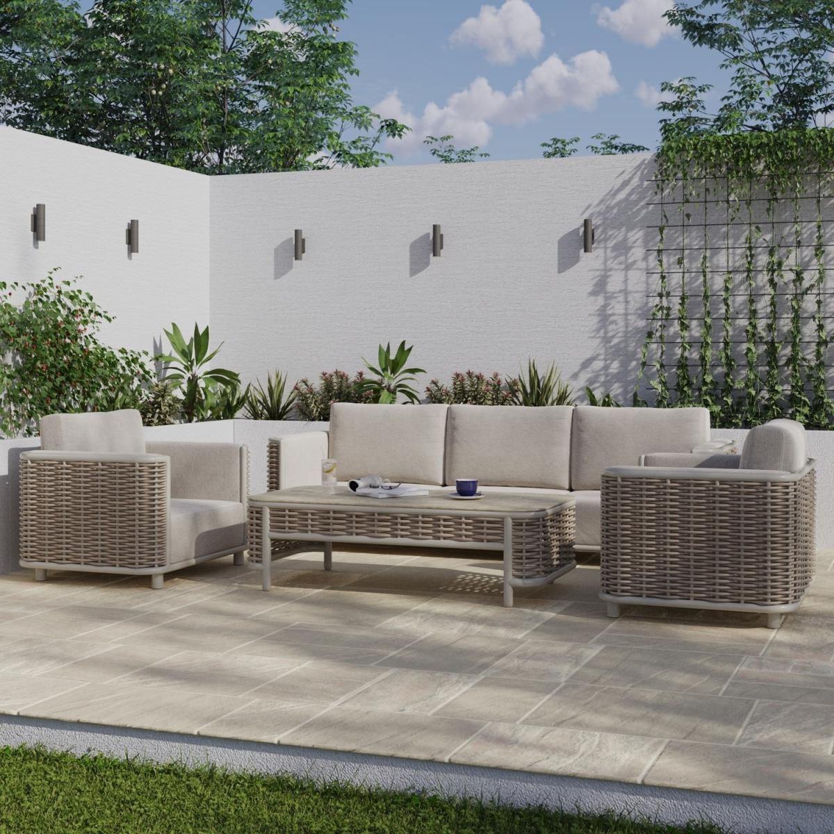 Includes a 3-seater sofa, two armchairs, and a matching coffee table, perfect for entertaining guests or relaxing outdoors. The stylish, weather-resistant design blends seamlessly with any modern or traditional outdoor setting. It’s rust-resistant, ensuring long-lasting durability in all weather conditions. Ultra-comfortable, thick, removable beige cushions with zip-off covers for easy washing. A highly durable printed stone-effect tabletop adds a sophisticated touch. Built to withstand the elements, making it perfect for all-season use. Enhance your outdoor living space with this stunning 5-seater garden sofa set, designed for both comfort and style. The neutral beige tones blend beautifully with nature, creating a relaxing, inviting space for entertaining or unwinding. There’s plenty of seating with the spacious 3-seater sofa, two armchairs, and a matching coffee table with a tempered glass tabletop for glasses of bubbly. Expertly crafted with durable aluminium frames, weather-resistant handwoven rattan, and super thick, deep-filled seat and back cushions, this garden set makes the perfect addition to any garden, patio, or outdoor lounge area.