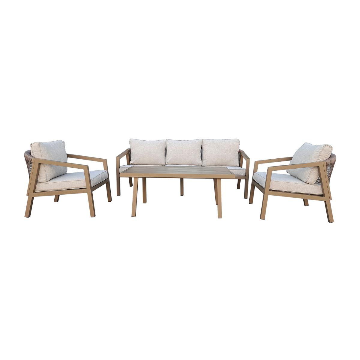 Manufactured using powder coated rustproof aluminium. Contemporary design with round weatherproof Textilene rope. Supplied with 10cm thick seat and 18cm back cushions. Set includes 5-seater corner sofa and aluminium table. Some simple assembly is required. Disclaimer Colours may slightly vary due to lighting conditions. 5 Seater Garden Luxury Sofa Sets - Sandy Brown