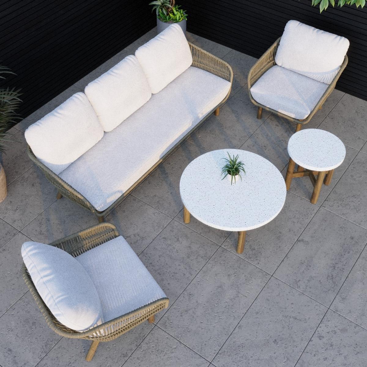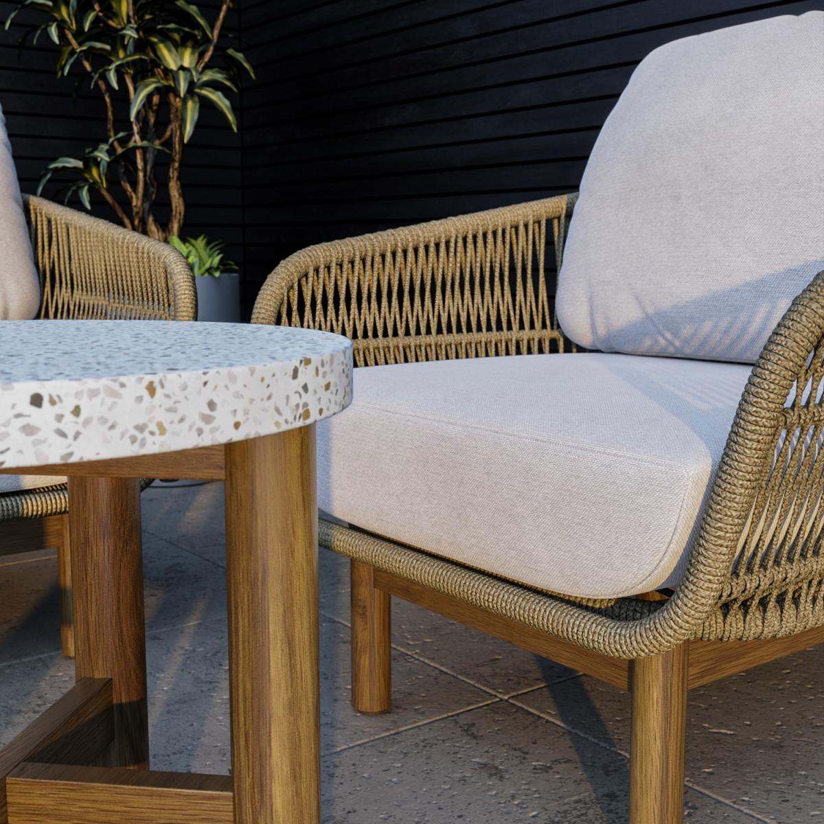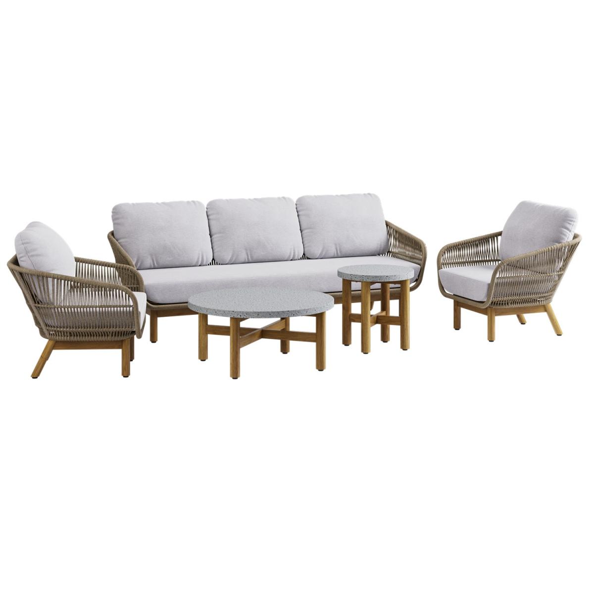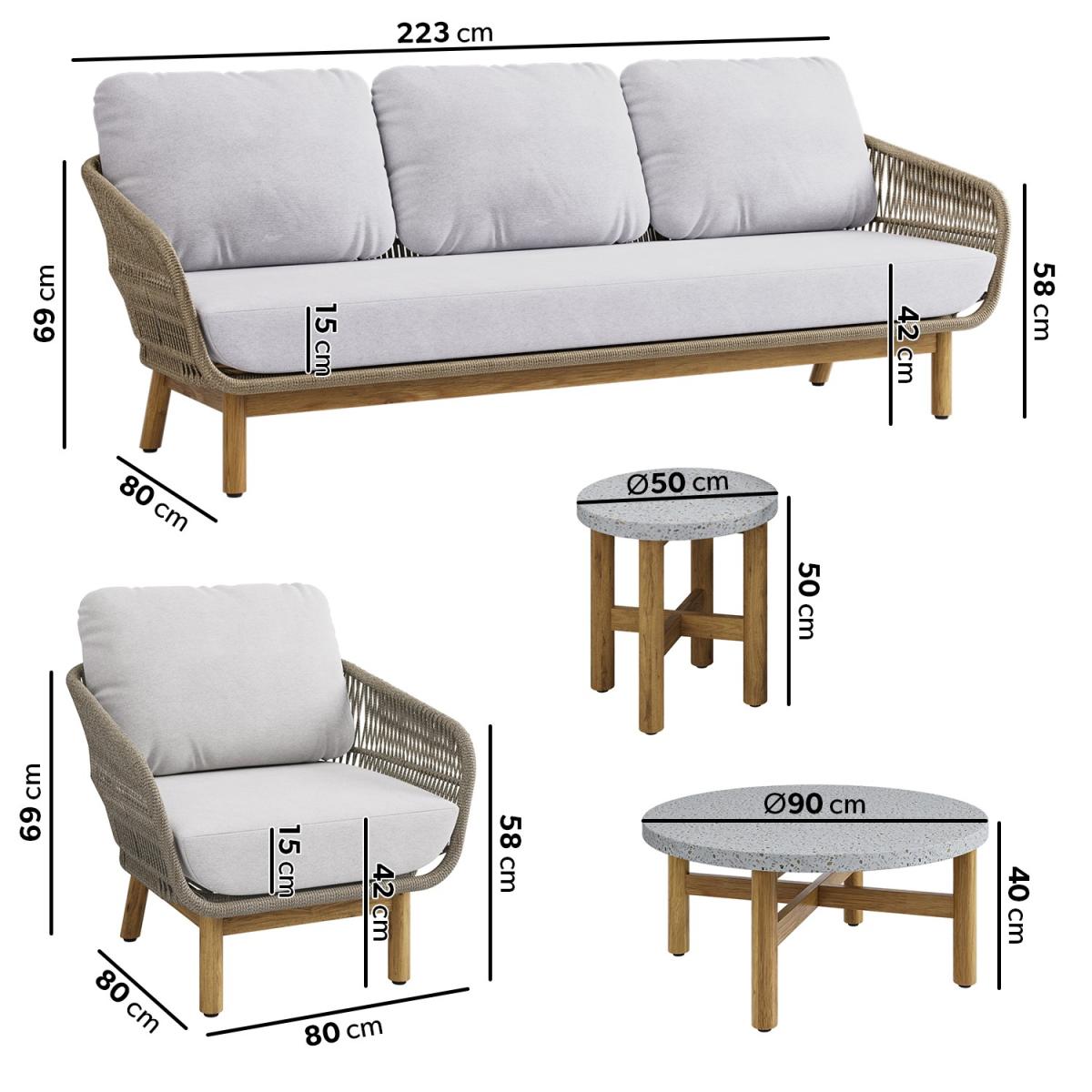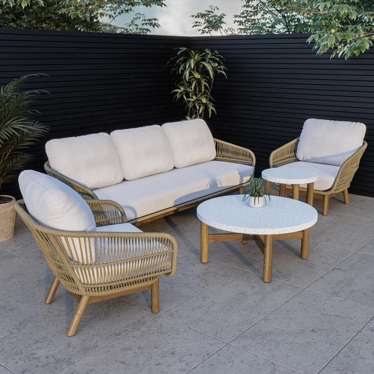 All about me This garden furniture set makes a stunning, neutral addition to any outdoor space or conservatory. With a sofa and two armchairs, there's enough seating for up to five people, and the comfy, luxurious cushions are perfect for relaxing on those warm summer evenings. The sturdy build is durable and water resistant, and the cushion covers are removable and easy to clean by hand or at 30 degrees in the washing machine. Enhance the life of your garden furniture- This product has been designed to be used outdoors. To make the most of your furniture, we recommend that you store it indoors, move it to a sheltered position or protect it by covering it up in bad weather and over the winter period. Why not invest in one of our garden stores? They keep upholstery, such as cushions, dry to prevent mould or mildew from forming. Need to know Sofa dimensions: W223 x D80 x H69 cm (31.5 kg) Chair dimensions: W80 x D80 x H69 cm (12 kg) Coffee table dimensions: W90 x D90 x H40 cm (51 kg) Side table dimensions:W50 x D50 x H50 cm (18 kg) Max supported weight per seat: 120 kg Max supported weight per table: Large- 60 kg, Small-35 kg Seats: 5 people Cushion thickness: 15 cm Colour: Brown mix, cream, and brown Finish: Rattan, upholstery, and natural wood Material: Twist rattan, aluminium frames, acacia wood legs, Terrazzo tabletops, cotton-filled cushions For use:Outdoors and indoors (suitable for wooden floors) Assembly required:Yes Total number of boxes: 2 What's included? 1 x 3-seater sofa 2 x Chairs 1 x Large coffee table 1 x Small side table