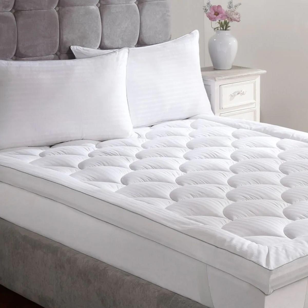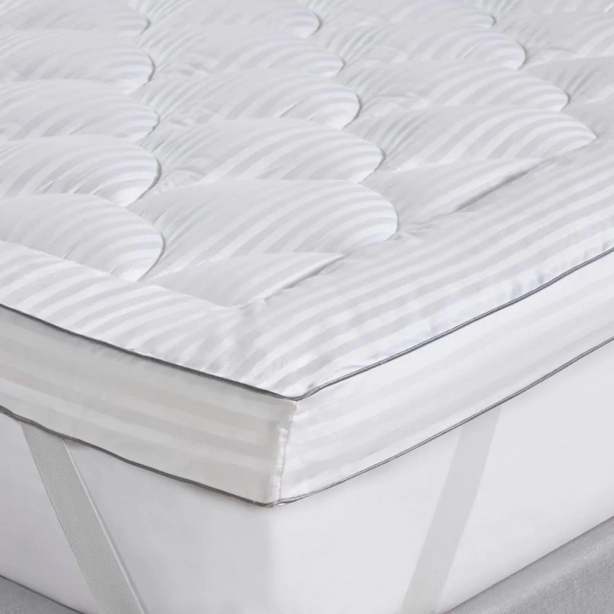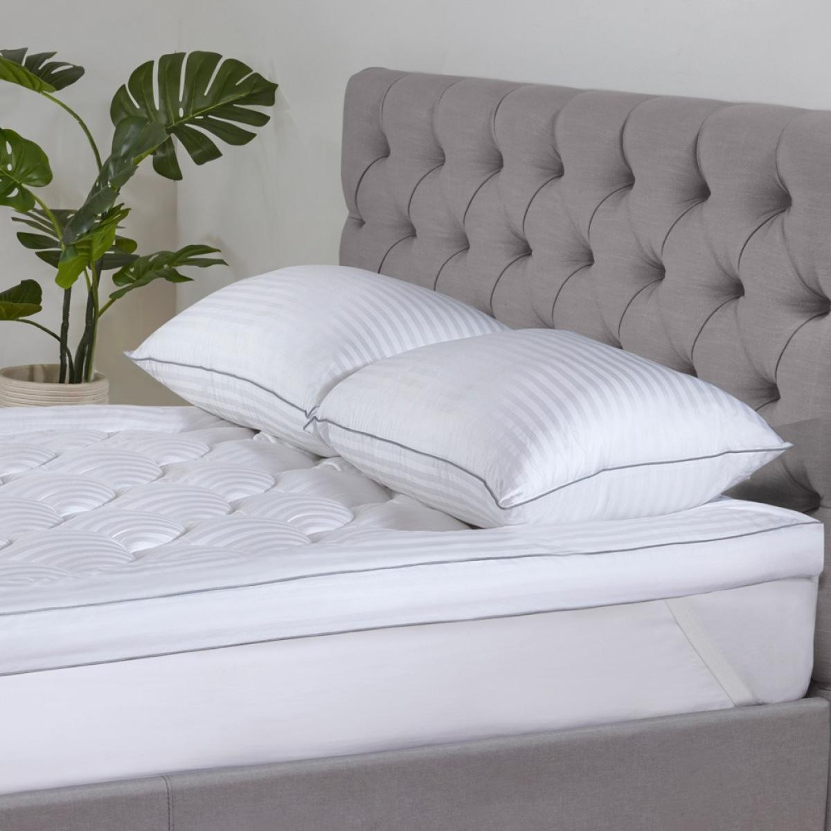 Mattress toppers are a popular choice for any bedroom arrangement in need of an extra touch of luxury and comfort, giving a layer between mattress and body that makes you feel like you’re sleeping on a cloud. This double mattress enhancer features a 60% Australian wool and 40% hollowfibre filling, so you’ll get a softer feel that helps you to drift off into a deep, relaxing sleep every night. A 100% cotton percale cover is used to complete the piece, with a 1cm dobby stipe adding extra texture to the topper.