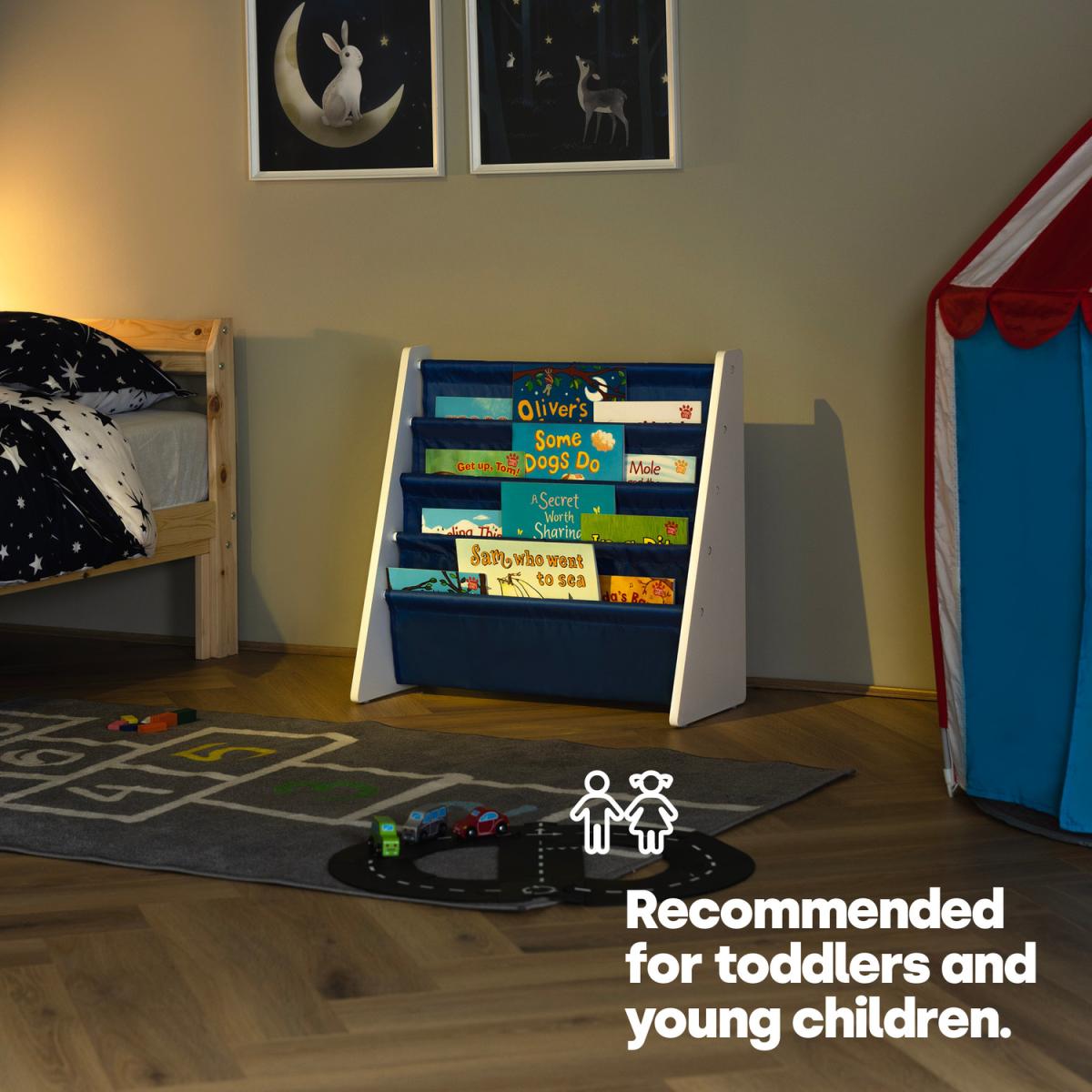 The LIVIVO Childrens Sling Storage Bookshelf is just the right height to serve as your little reader's first bookshelf. Promoting organisation and reading skills, it is wide enough to display books by the front or back cover, making it easy for children to find their favourite books. Constructed of a sturdy natural wood laminated MDF frame connected and supporting steel rods, the LIVIVO Childrens Sling Storage Bookshelf features 5 strong Nylon Fabric Pockets, suitable for a range of books of varying size and thickness.