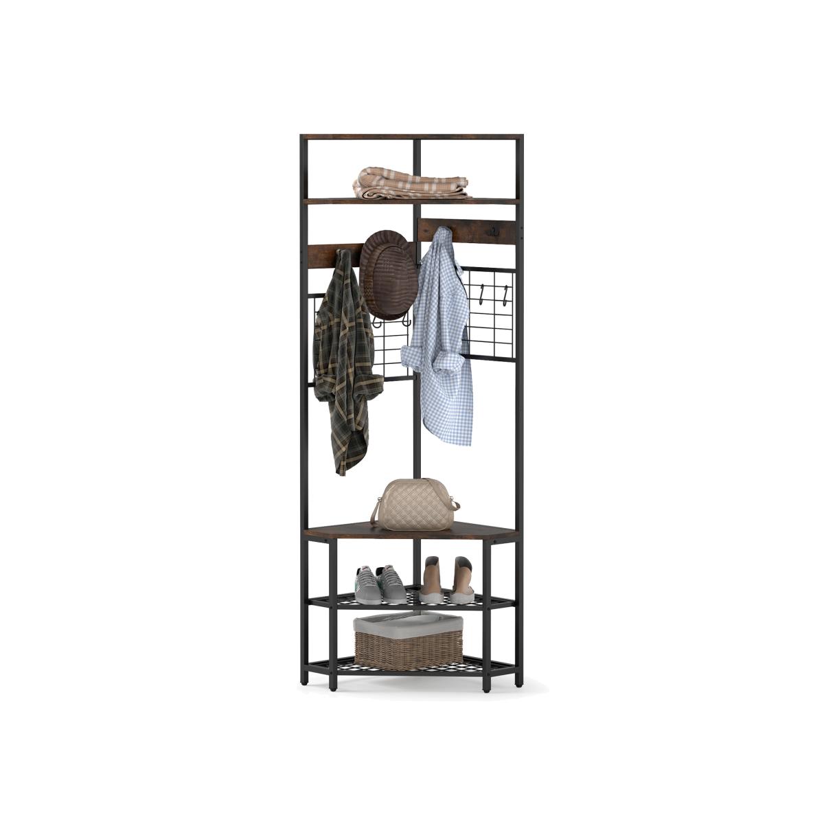 Tailored to fit snugly into corners, this coat rack provides a smart solution for keeping your essentials organized. In addition to the top shelves, the integration of 4 fixed hooks and 8 S-shaped hooks is convenient to hang coats, scarves, hats, and bags. Below the hanging area, the storage bench and 2-tier shoe rack facilitate the placement of shoes, keeping your entryway organized and clutter-free. The shoe bench provides a comfortable seating area while putting on or taking off your shoes.