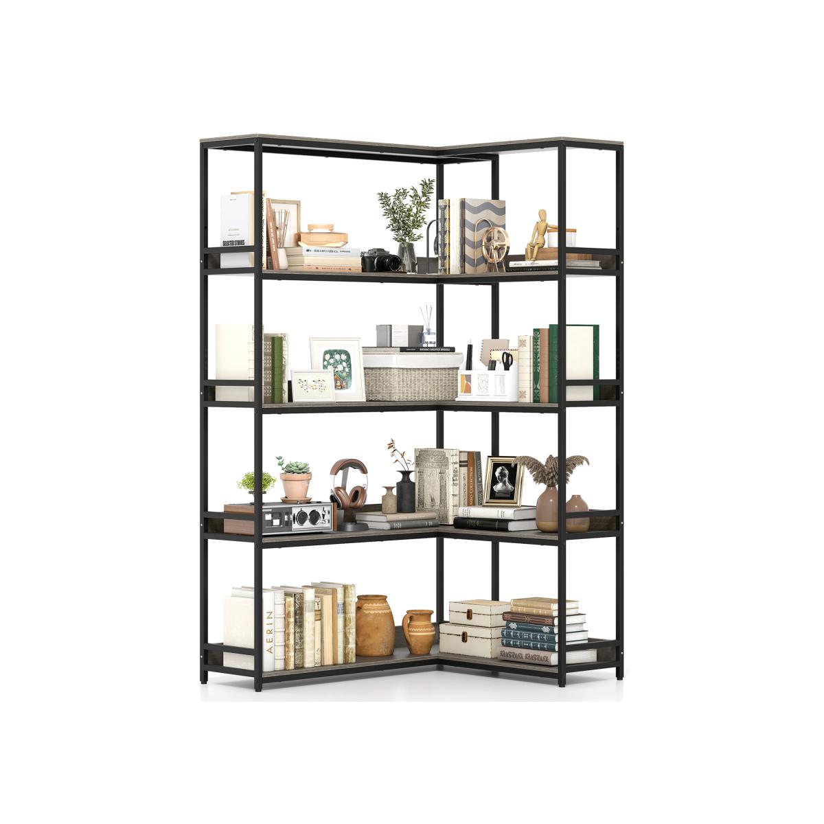 Optimize your space and organization with this 5-tier corner bookcase! Perfectly designed to fit any corner, this L-shaped bookshelf makes efficient use of space. Each tier is spacious enough to display books, storage boxes, photos, and other treasures, enhancing the aesthetic of your room while keeping it organized. The metal frame not only reinforces the structure but also adds an industrial flair that complements various home styles. Moreover, the anti-toppling kits and adjustable foot pads improve stability and safety. Additionally, this industrial etagere bookshelf is suitable for both home and office use.
