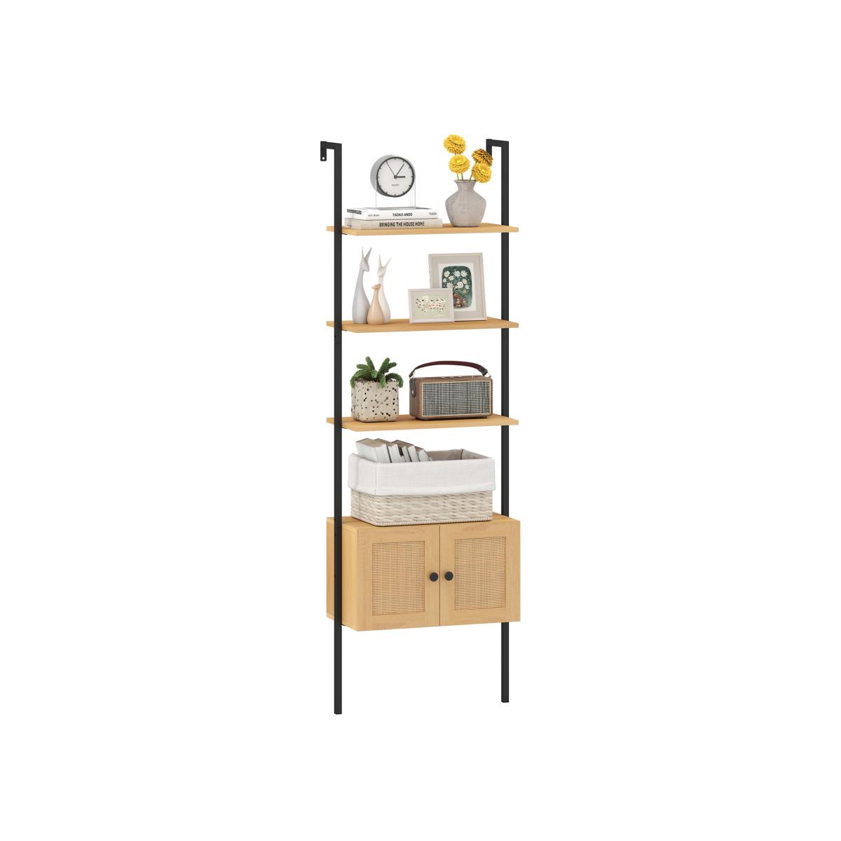 Elevate storage and display space with this 5-tier bookcase with cabinet! Thanks to double anti-tipping design, the ladder bookcase can be securely fastened to the wall. The blend of open shelving and enclosed storage cabinet makes this piece suitable for multiple uses from a book display to an organizational hub. Constructed with a sturdy metal frame, this wall-mounted bookshelf is built to last and hold a variety of items securely. Moreover, the eye-catching rattan cabinet doors add highlight to various occasions, either for home and office.