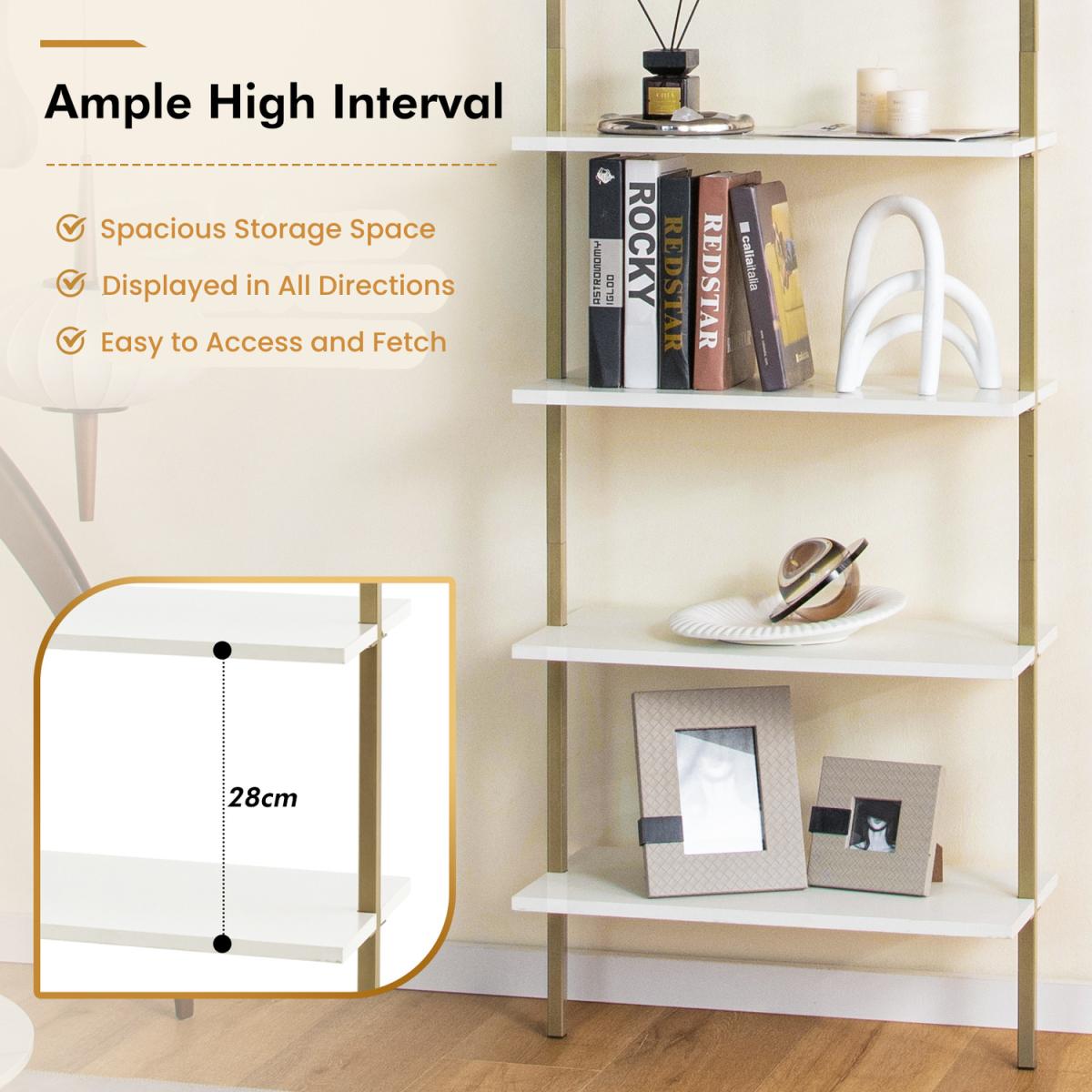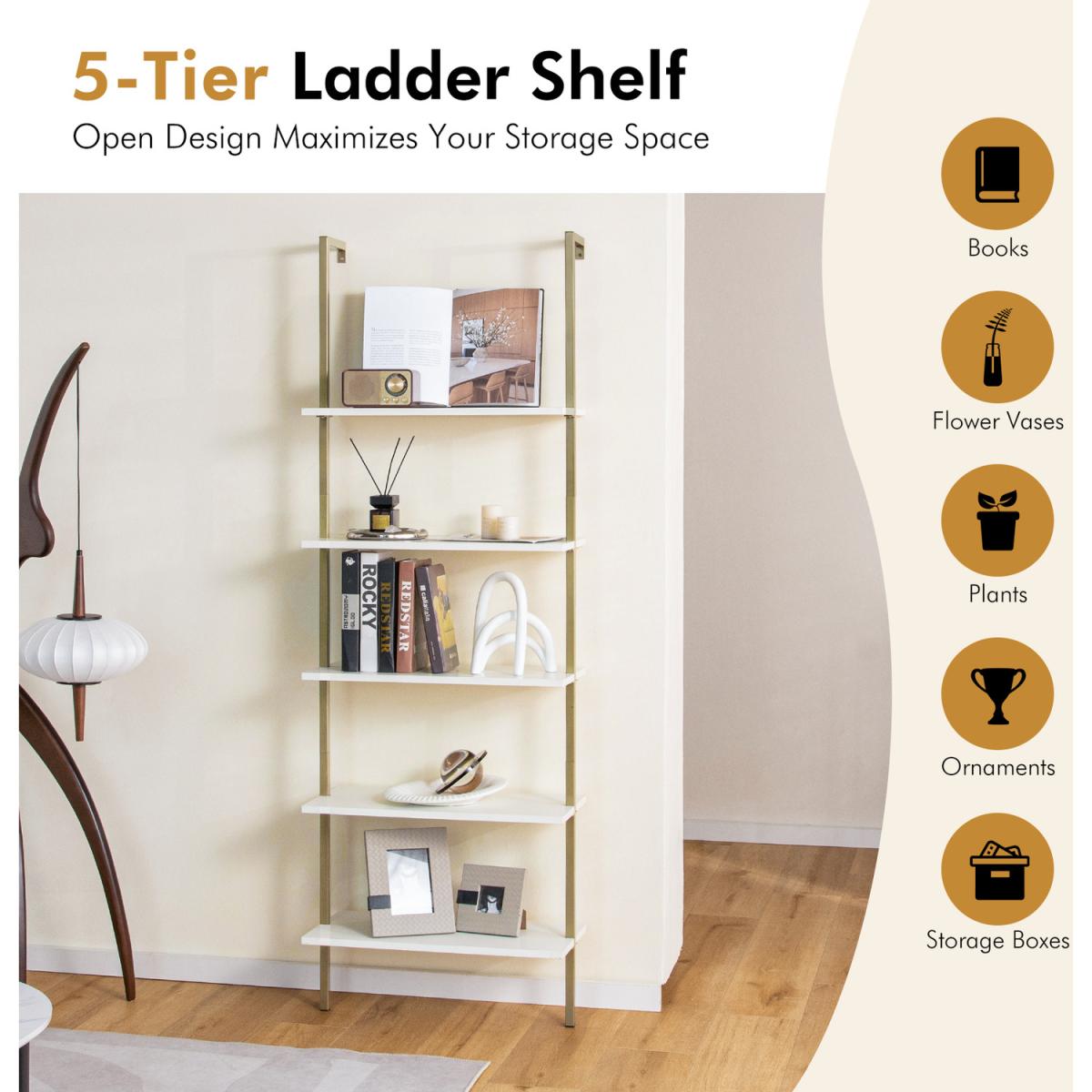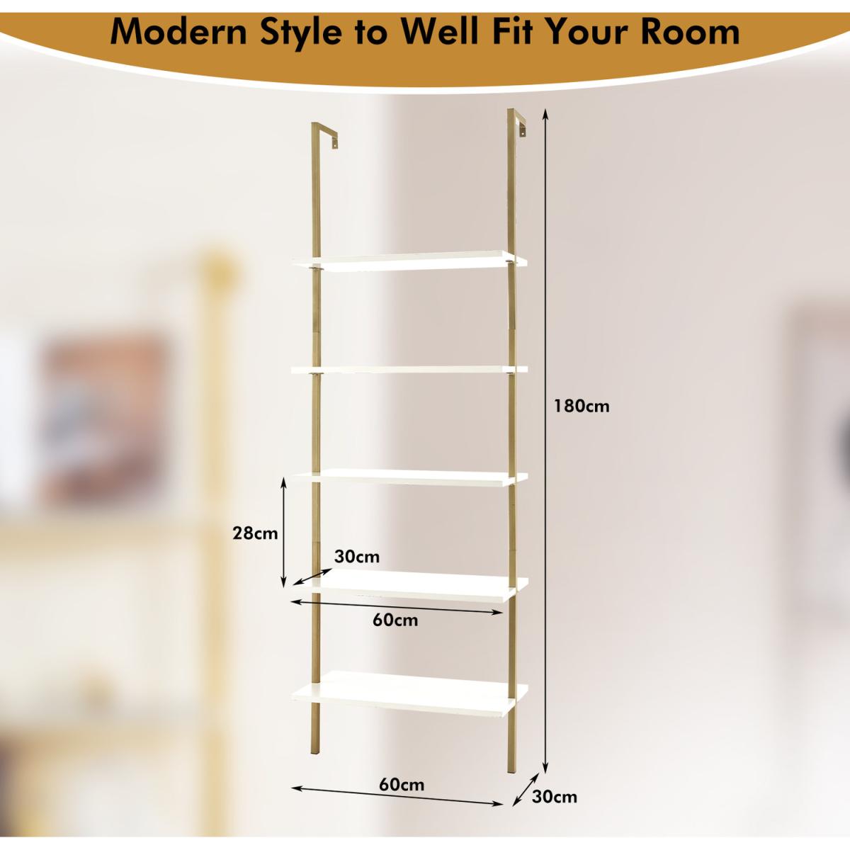 Improve your living space with this minimalist wall bookshelf! This 5-tier ladder shelf features a wall-mounted design that is easily installed in any place without taking much room. With five open shelves, this storage shelf allows you to store more items while keeping your room organized and tidy. It can be used to decorate your home or office by displaying books, magazines, vases, plant pots, and antiques. The simple ladder shelf adopts a less-is-more approach, which stands the test of time and never goes out of style!