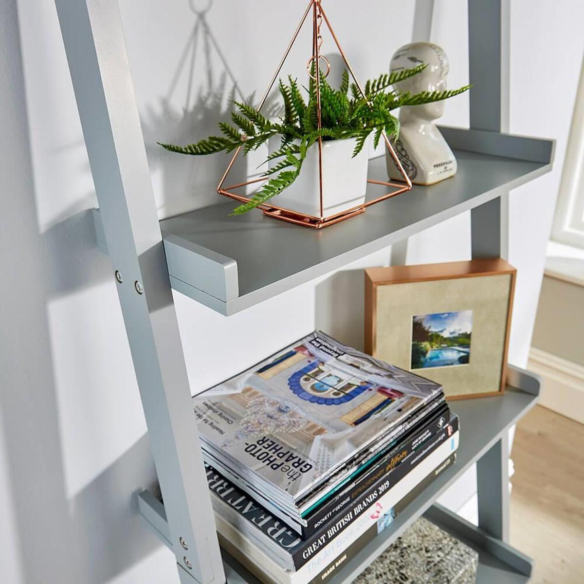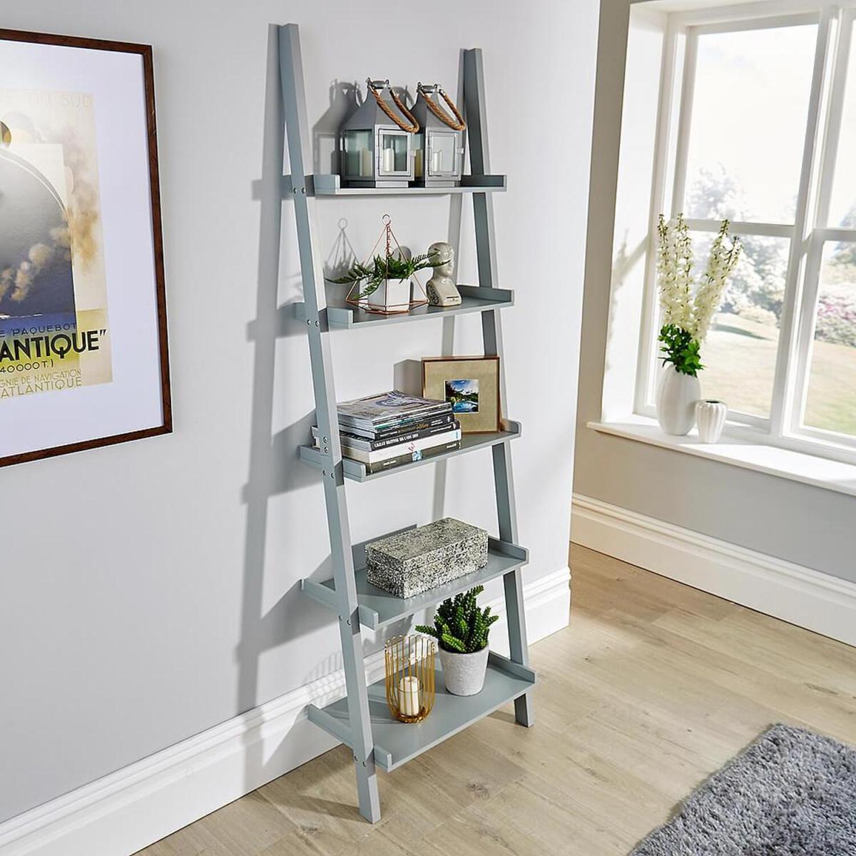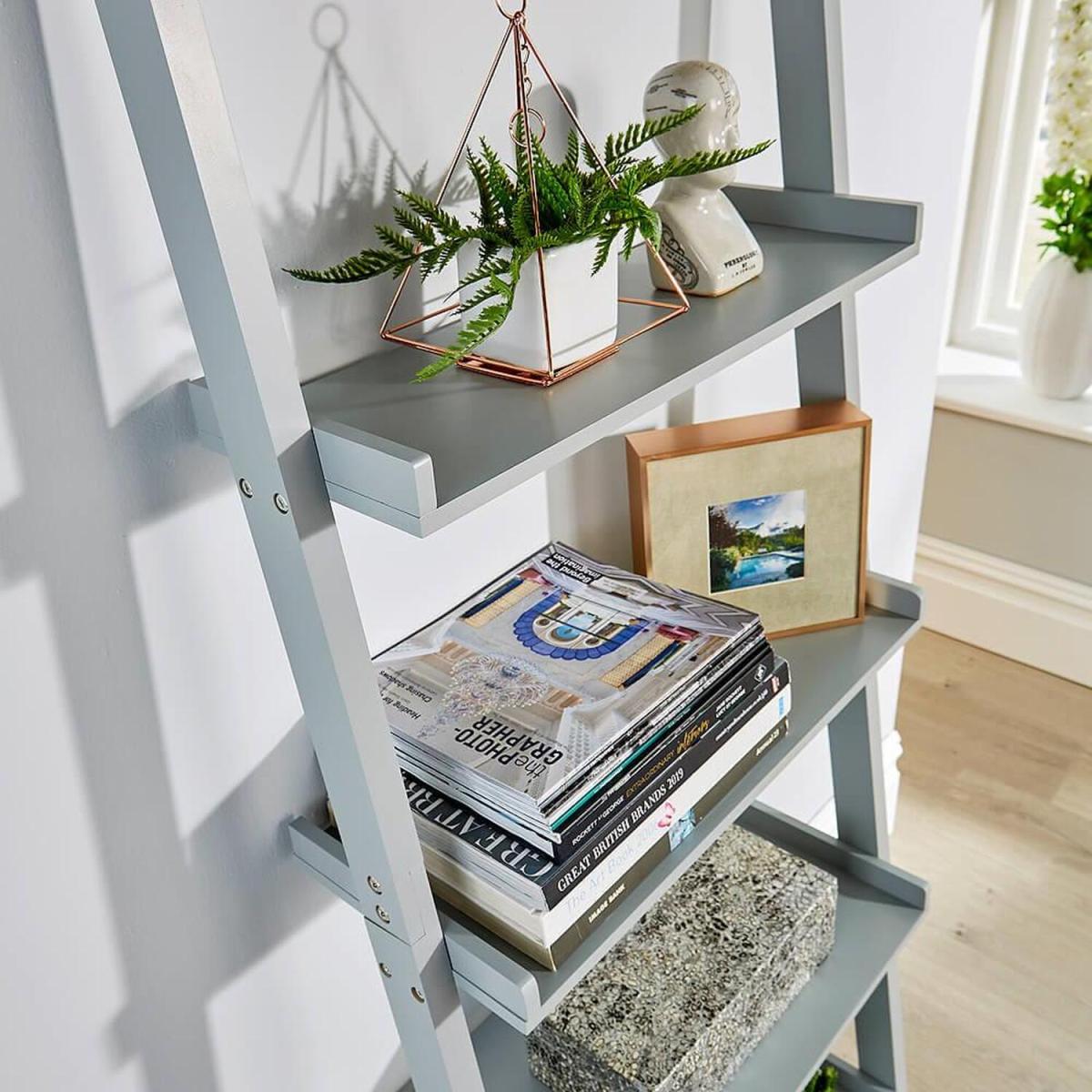 I’m a big fan of this grey ladder shelf for its clean lines and versatility. It slots neatly into a Scandi-inspired living room or a minimalist home office, and the muted grey finish works equally well against a white wall or a deeper accent colour. The open tiers keep the room feeling airy, while its slim profile is great for narrow hallways or beside a sofa. For practical styling, mix books with small storage baskets on the lower shelves and reserve the eye-level tiers for decorative pieces - think a ceramic vase, framed photo or a trailing plant. Vary heights and textures in odd numbers to keep the display dynamic, and leave a few shelves deliberately sparse to avoid a cluttered look.