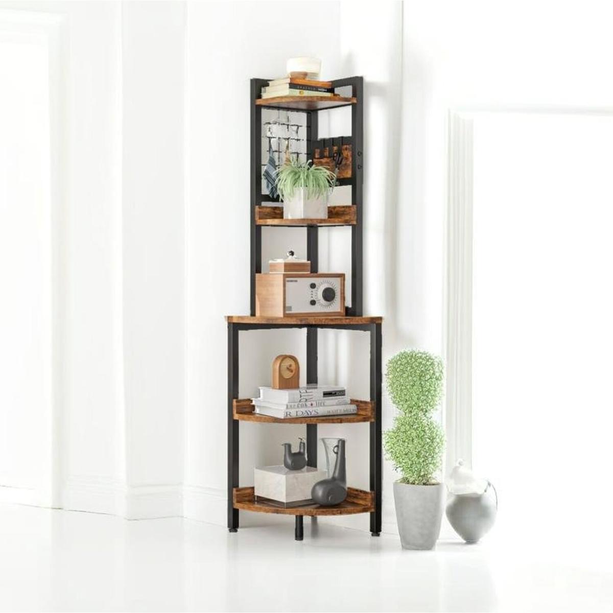 This corner shelf unit, designed with a 90 right angle, optimally utilizes unused corners and fits seamlessly into any room. It's ideal for use as a corner stand, small bookshelf, display shelf, plant stand, or flower rack in compact spaces. The design includes extra support with adjustable feet for stability on uneven ground and anti-toppling fittings to secure it to the wall, ensuring safety. The smooth round edges prevent scratches, and baffles on the sides keep small items from falling. With five tiers, this shelf offers ample storage and includes additional S hooks and metal hooks for keys and small ornaments. Constructed from a heavy-duty metal frame and high-quality particle board, it is built for stability and durability, supporting heavier items like kitchenware or small aquariums. Assembly is required, but the included instructions and marked parts make it easy. If you encounter any issues, support is available.